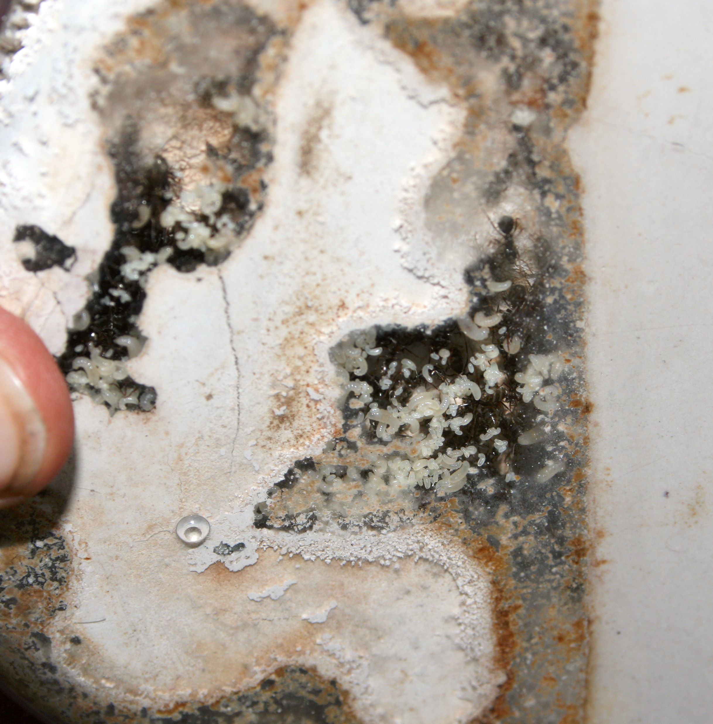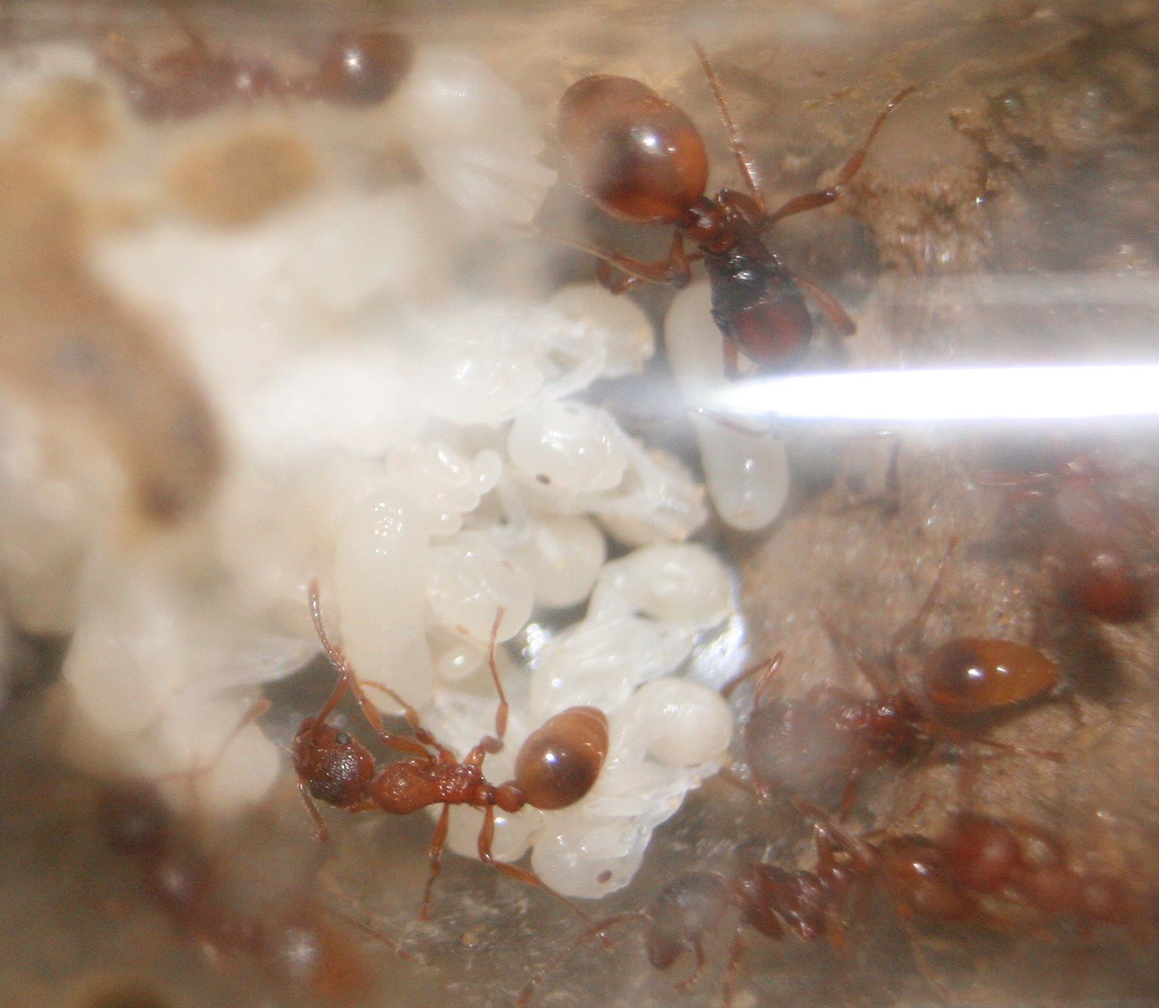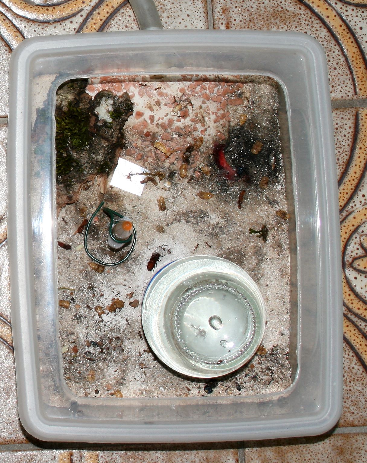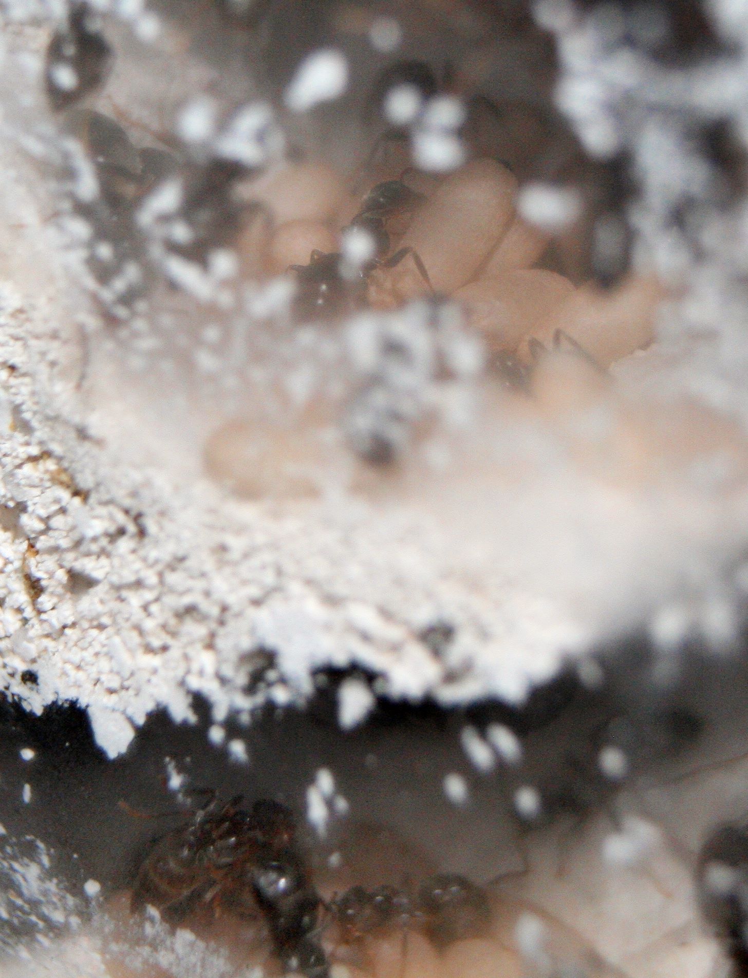 Bei den Formica liegen noch einige Puppen rum, ein großer Teil ist bereits geschlüpft und schon unterwegs, den entsorgten leeren Hüllen nach. Larven sind auch schon wieder jede Menge unterwegs.
