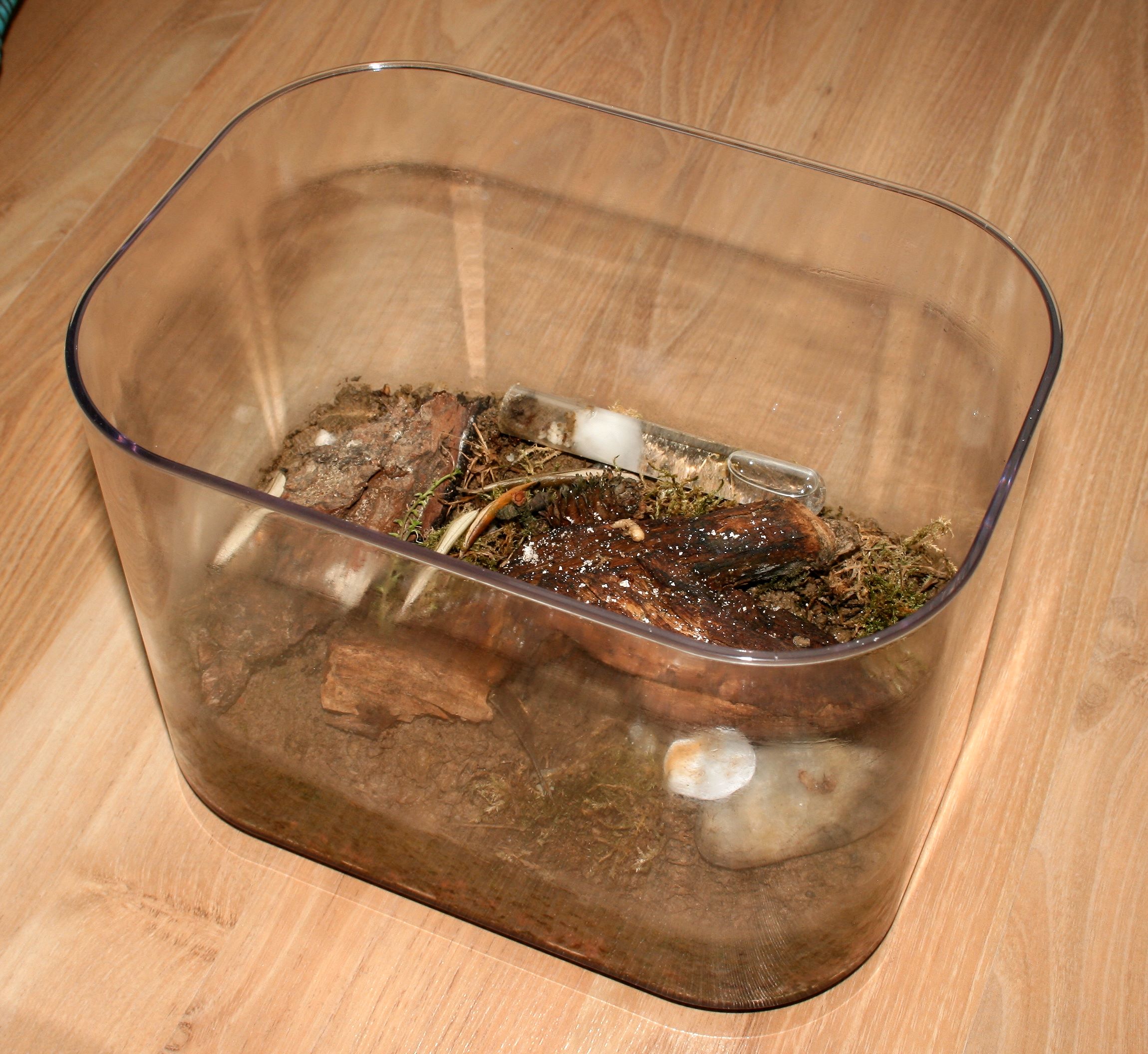 In der neuen Box befindet sich neben etwas Geäst zum herumklettern auch ein Stückchen Holz, das bereits etwas kernfaul ist und wenn sie wollen, können sie auch gleich dort einziehen, wenn sie es soweit vorbereitet haben.