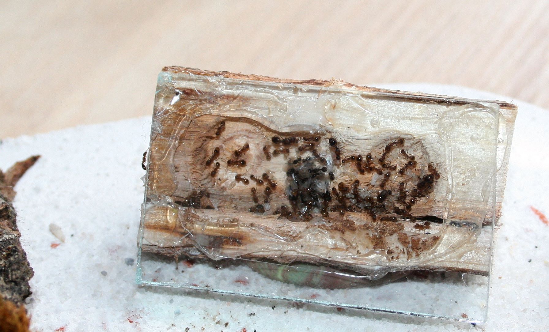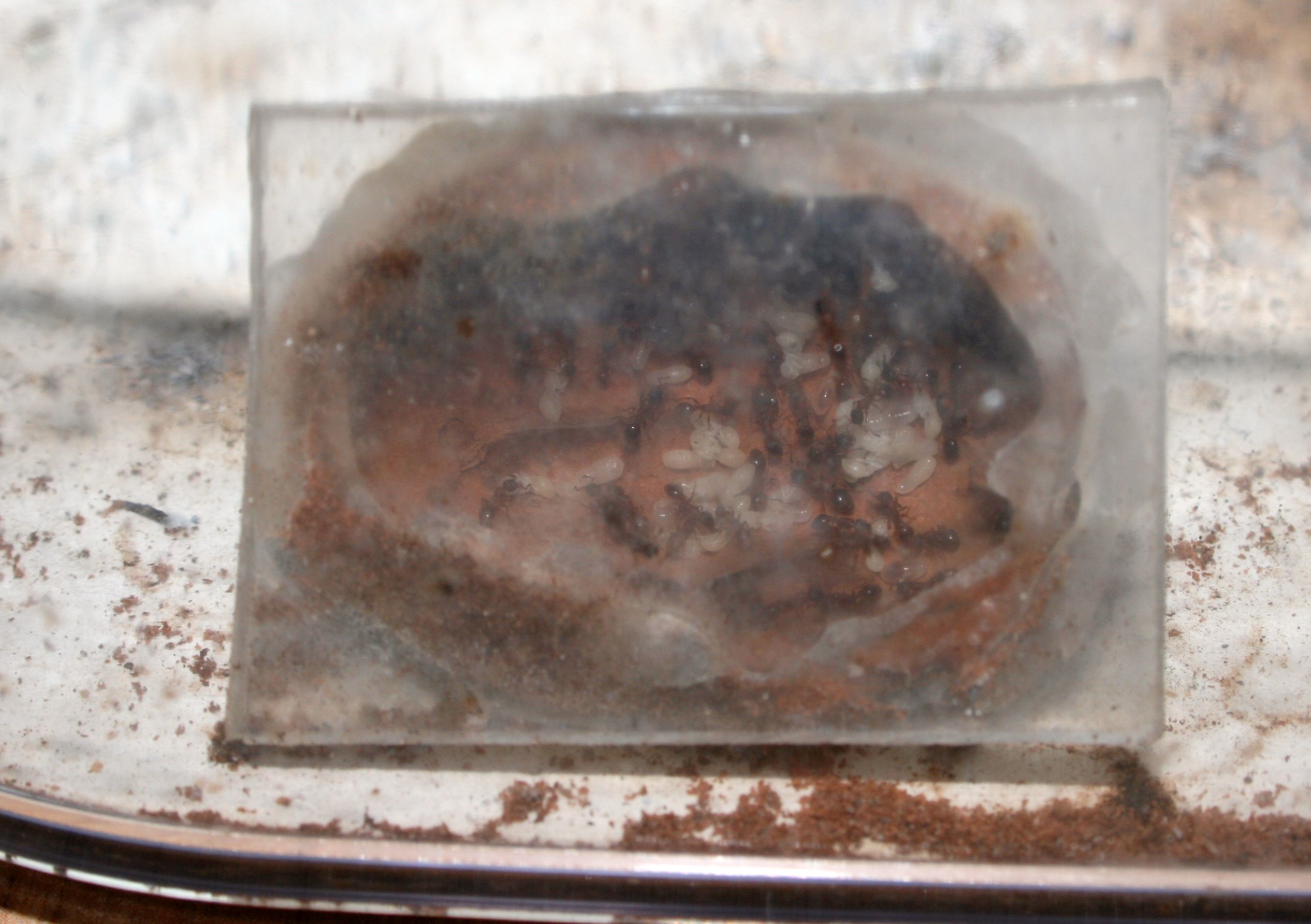 Sie leben in der Box mit dem ersten integrierten Gipsnest, was man auch erkennen kann, denn sie haben so ziemlich alles umgestaltet wie man sieht. Dafür kann man gut die Brut erkennen, die sie unten auf dem Boden der selbstgegrabenen Gänge liegen haben, wenn man das Ganze hochhebt.