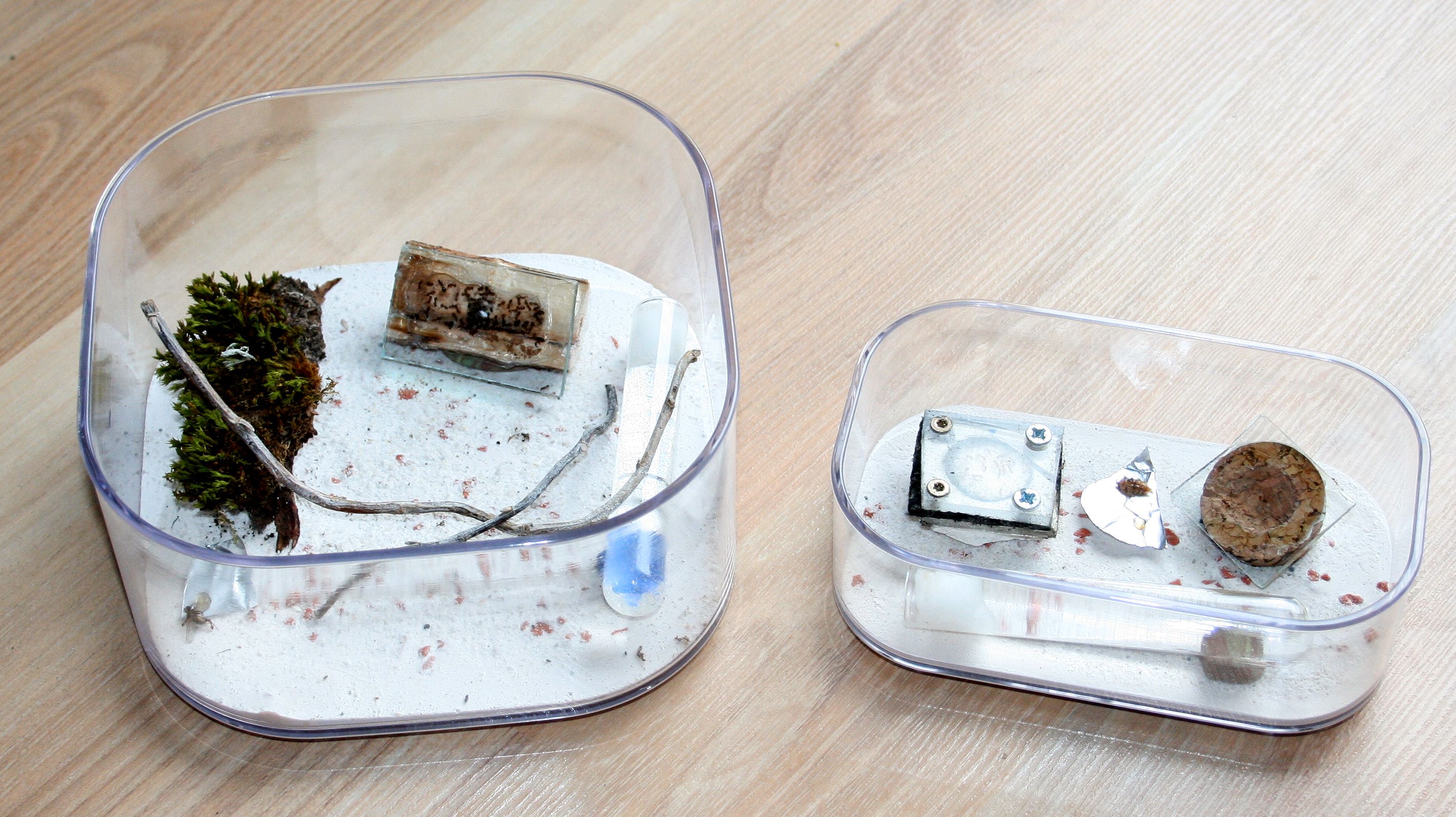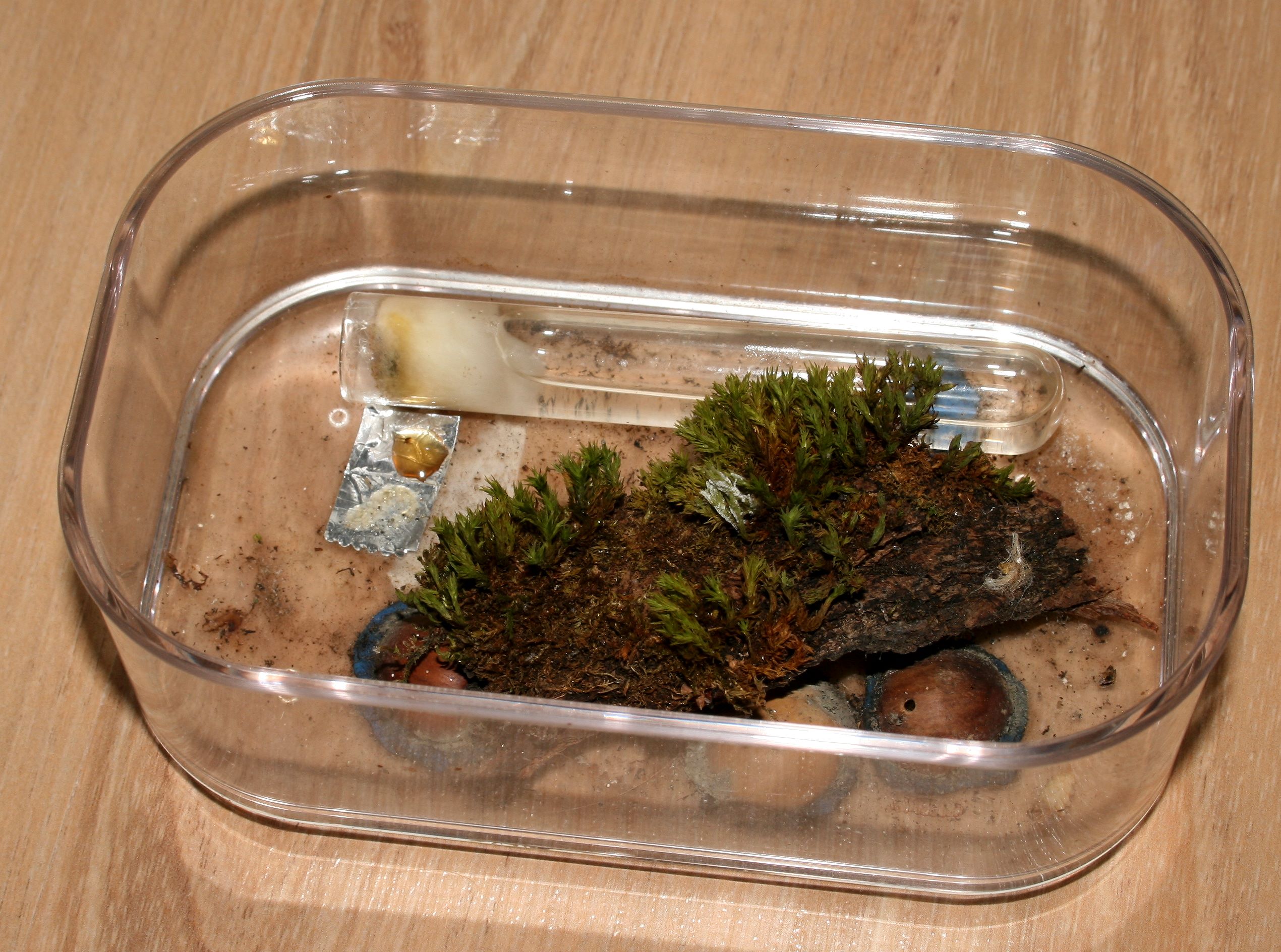 befinden sich in einer Box mit Gipsboden und einem Walnussnest. Sie stammen ursprünglich aus einem Stückchen Holz aus dem Wald.