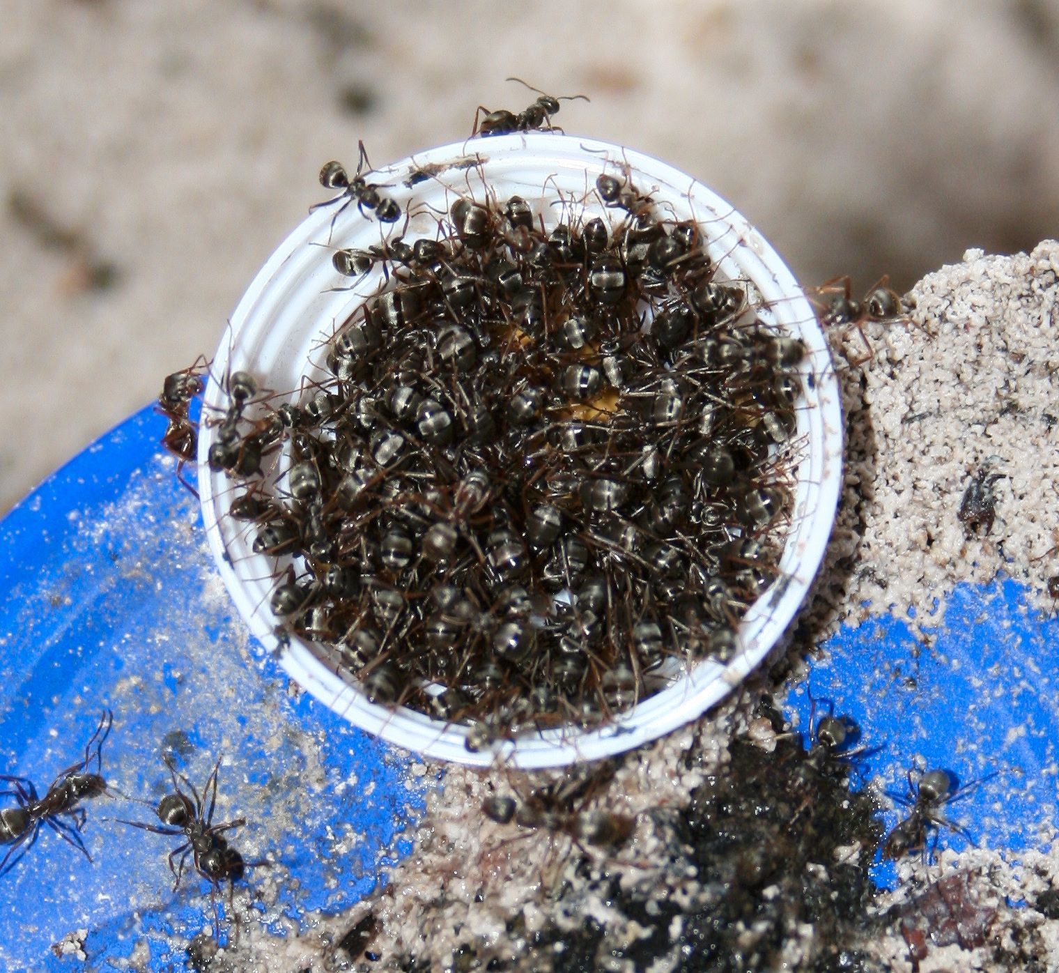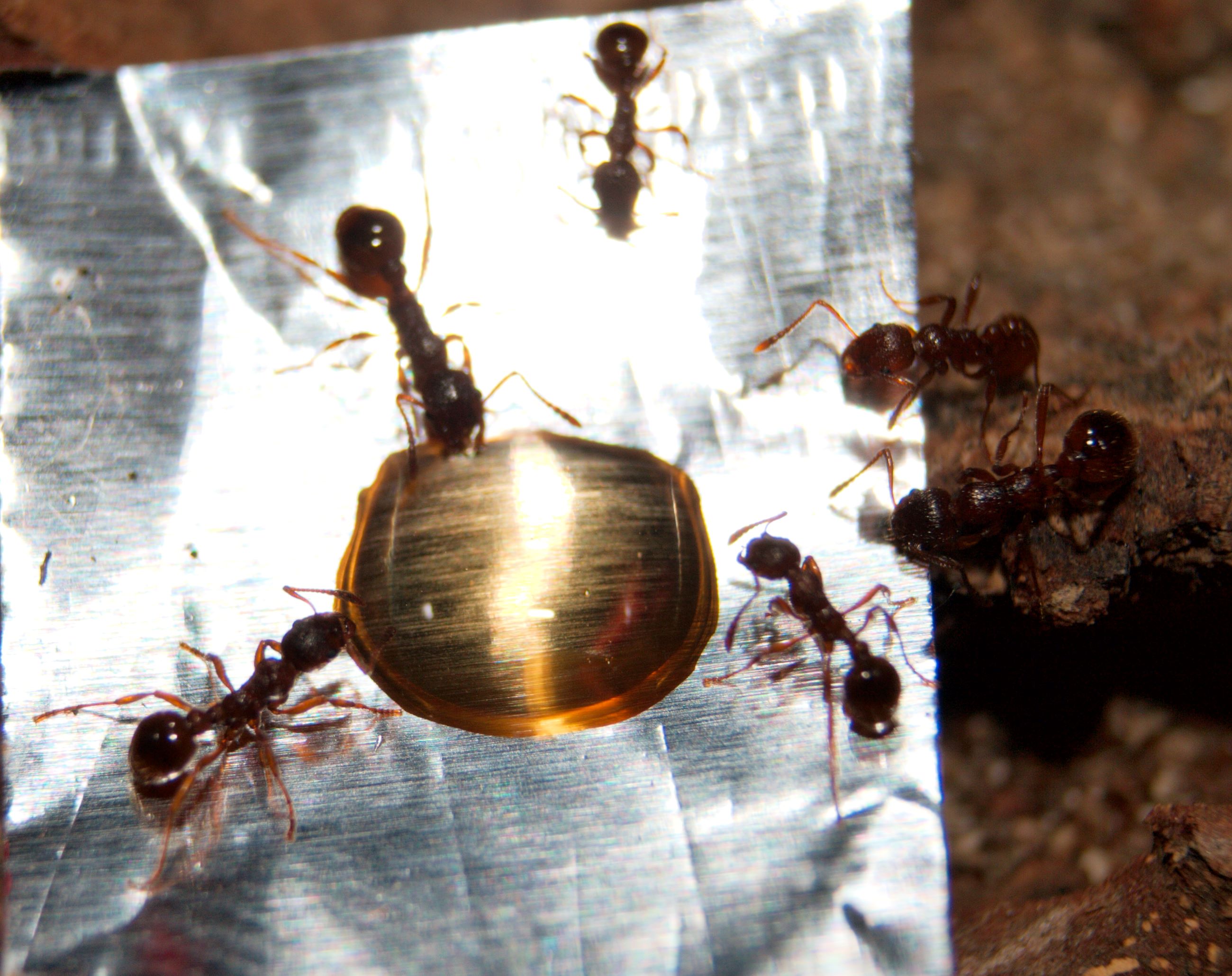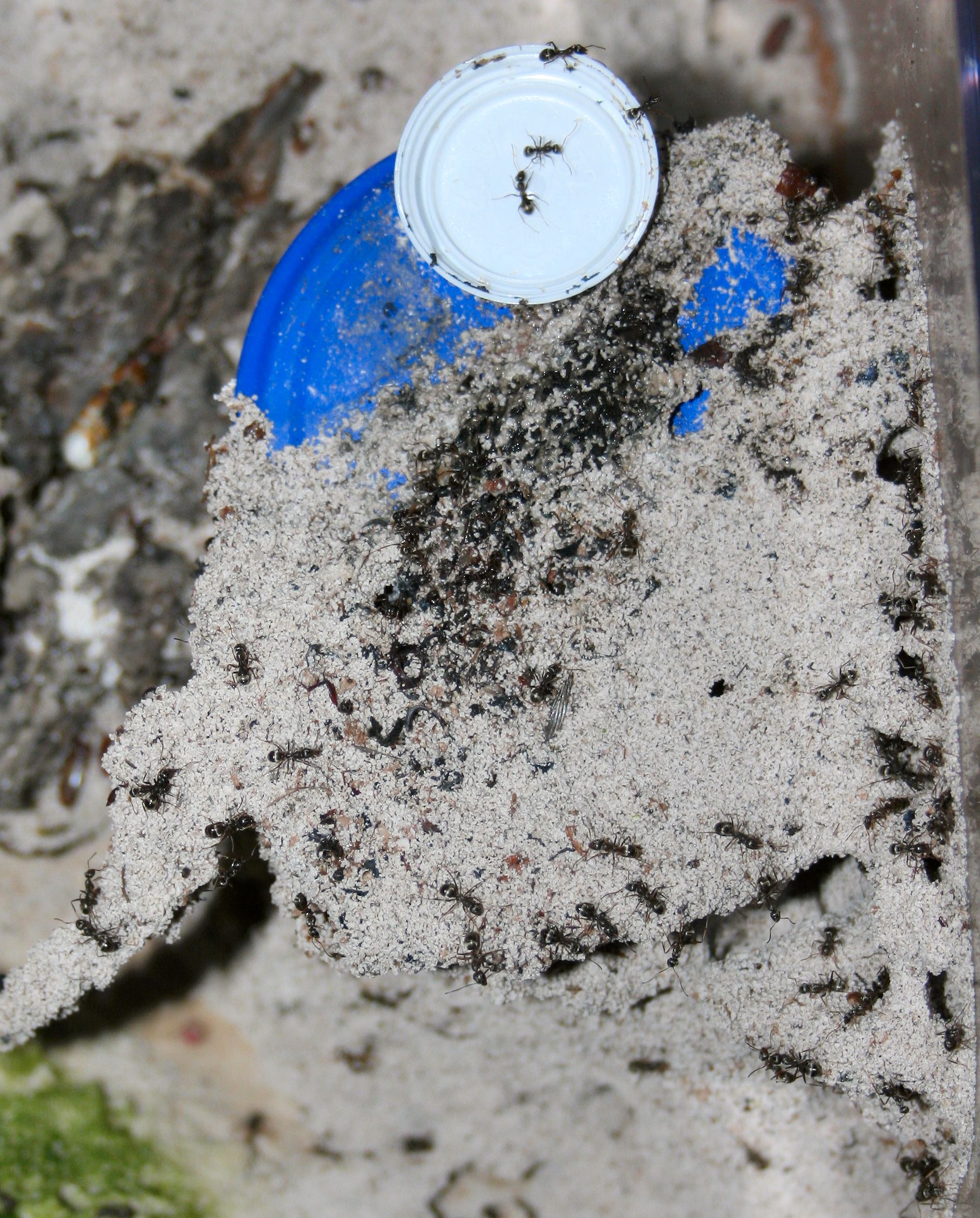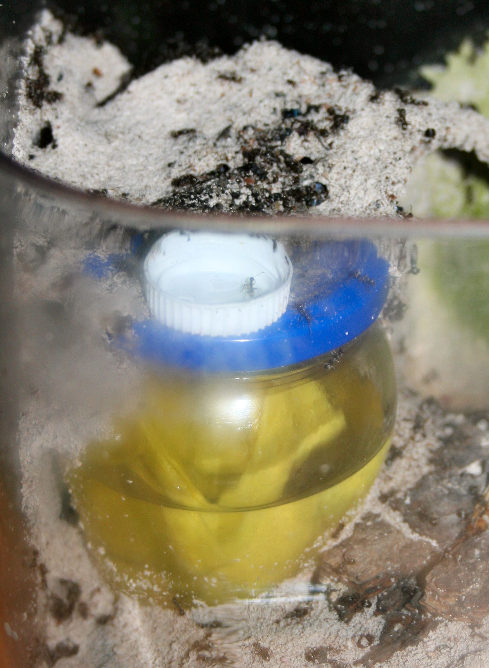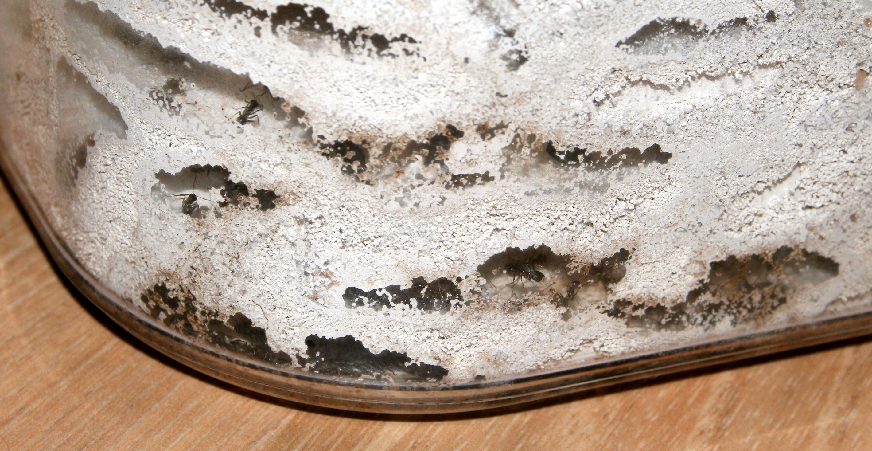 So, nun ist es passiert. Es hat auch mich erwischt, die Ameisen sind los. Gut, bei 20-30 Lasius niger kann man nicht unbedingt von einer Invasion sprechen, ausserdem hab ich kaum eine weiter als einen Meter vom Formi entfernt gefunden, aber diese Luder haben es tatsächlich geschafft, über das Paraffinöl am Rand UND das am Deckel bis zur Öffnung in der Mitte zu gelangen.