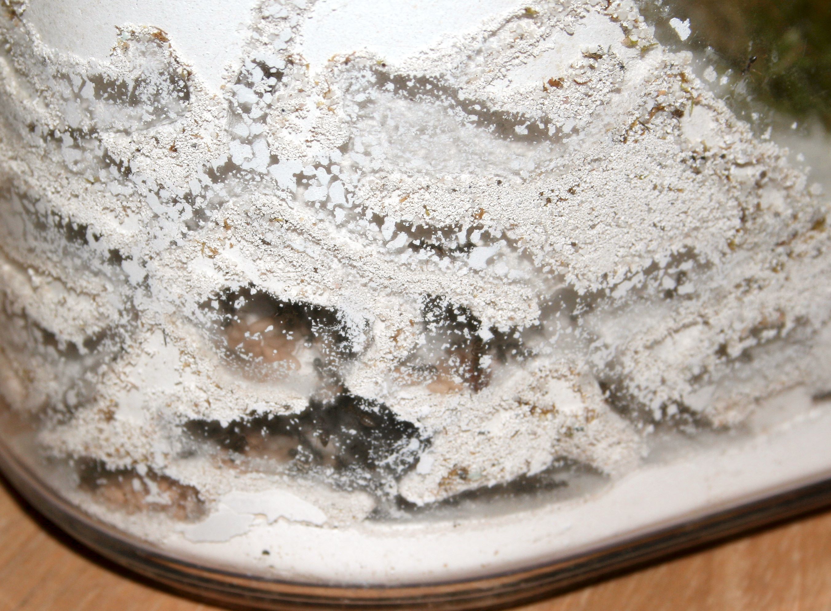 wie man hier erkennen kann, haben die Ameisen um den -docht der Tränke wieder Material entfernt. Möglicherweise wurde es ihnen zu feucht, denn das Formi war teilweise schon sehr beschlagen von innen. Jetzt hat es sich wieder normalisiert.