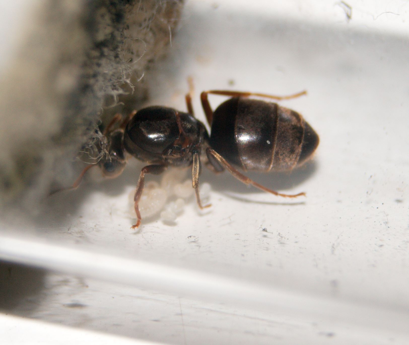 Diese Gyne stammt vom letztjährigen SF (30.7.15), hat eber jetzt erst Eier. ich wollte eigentlich mal vergleichen, wie sich Lasius niger und Lasius flavus in der Gründungsgeschwindigkeit unterscheiden, aber da tun sich beide nichts weg.