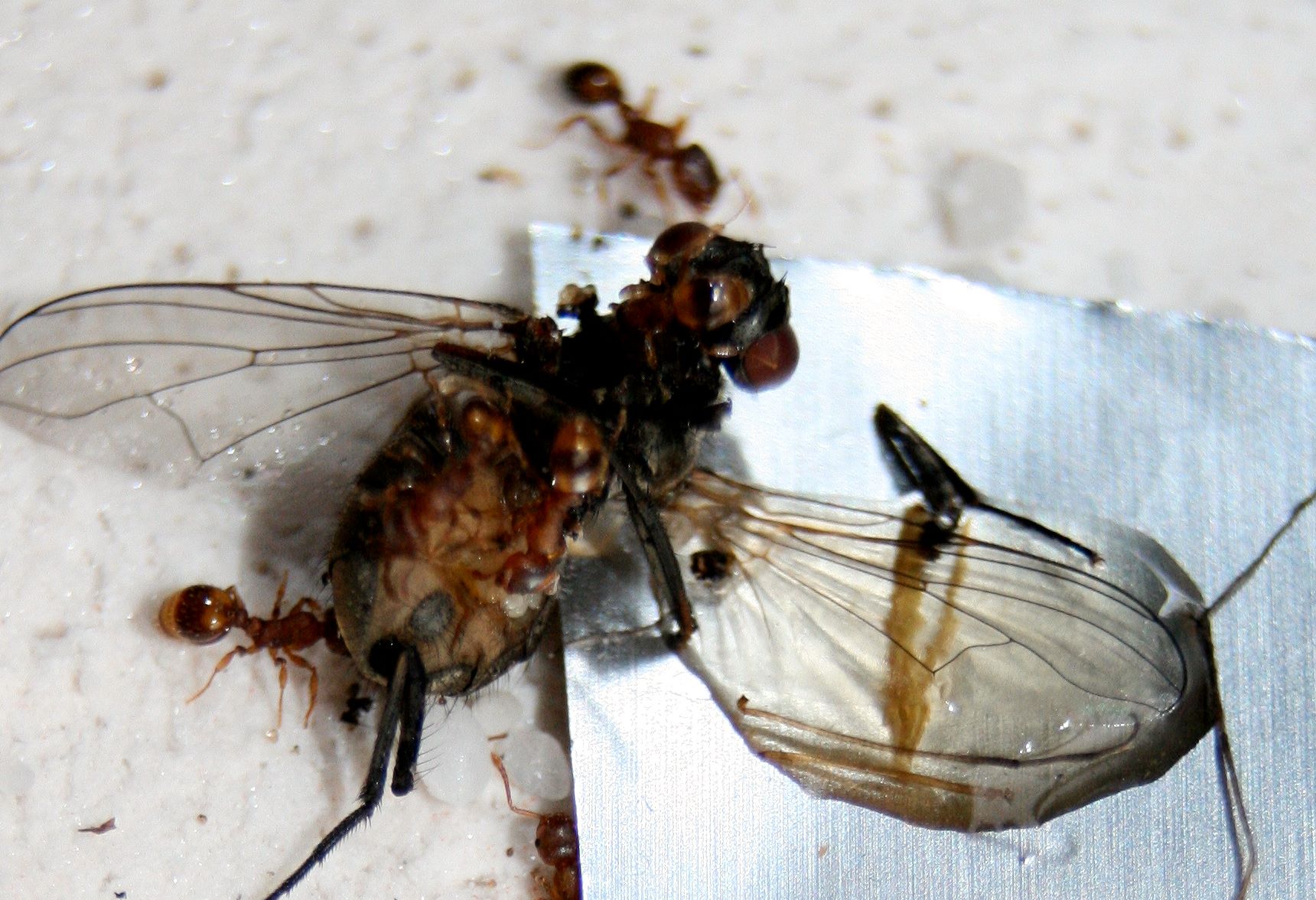 Bei den Myrmica nebenan waren dann noch zwei zu sehen. Die Myrmica rubra haben sich eh lieber um die dicke Fliege gekümmert.