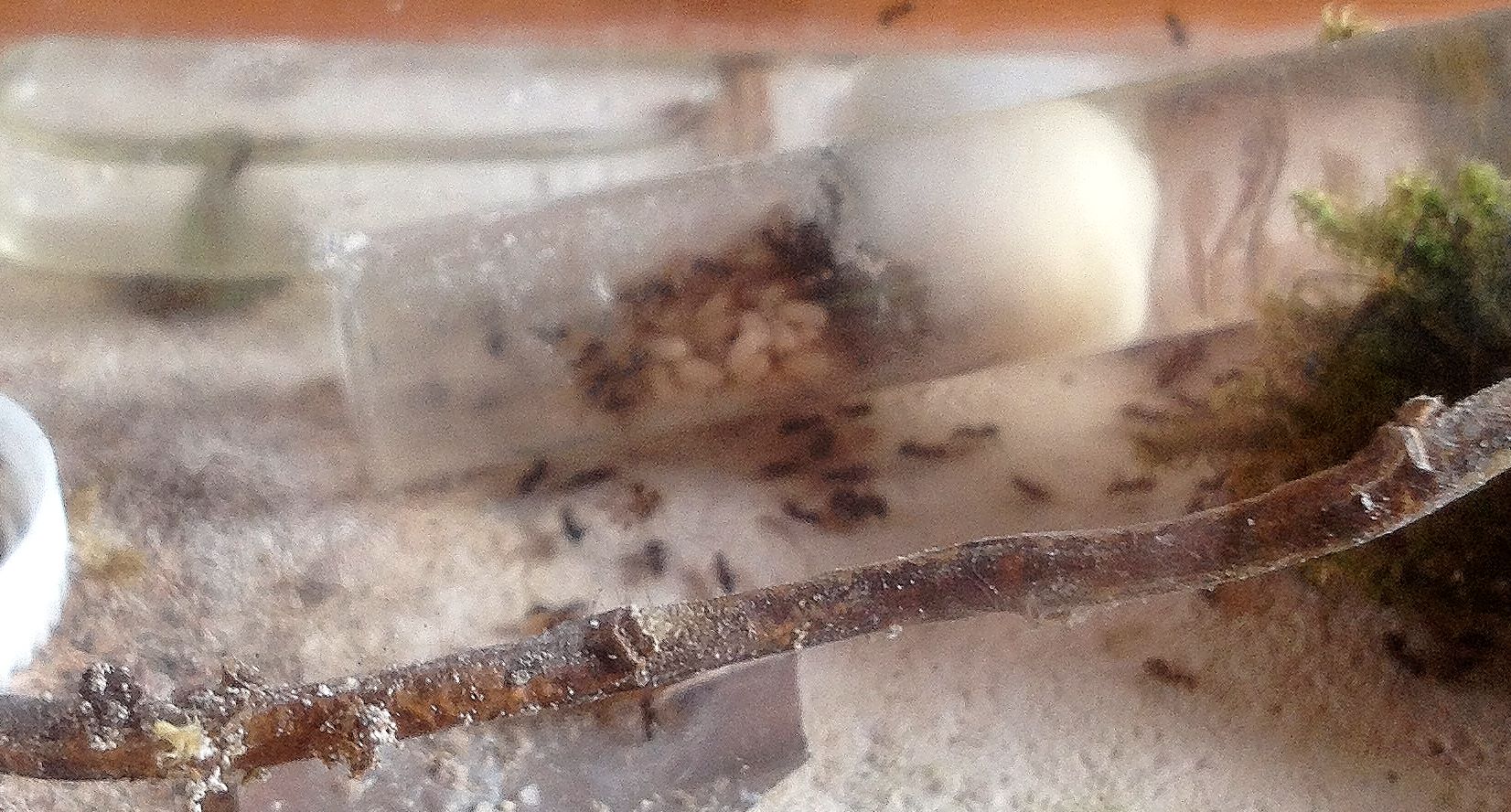 Bei den Myrmica im Erdnest erfreuen sich die Asseln bester Laune, daher hab ich ein paar auch auf das andere Volk aufgeteilt. Mit genügend Versteckmöglichkeiten ist das auch kein Problem, nur in die anderen Behälter sollte man sie vielleicht nicht so ohne Quarantäne werfen, zumindest nicht, solange ihnen noch der fremde Geruch anhaftet.