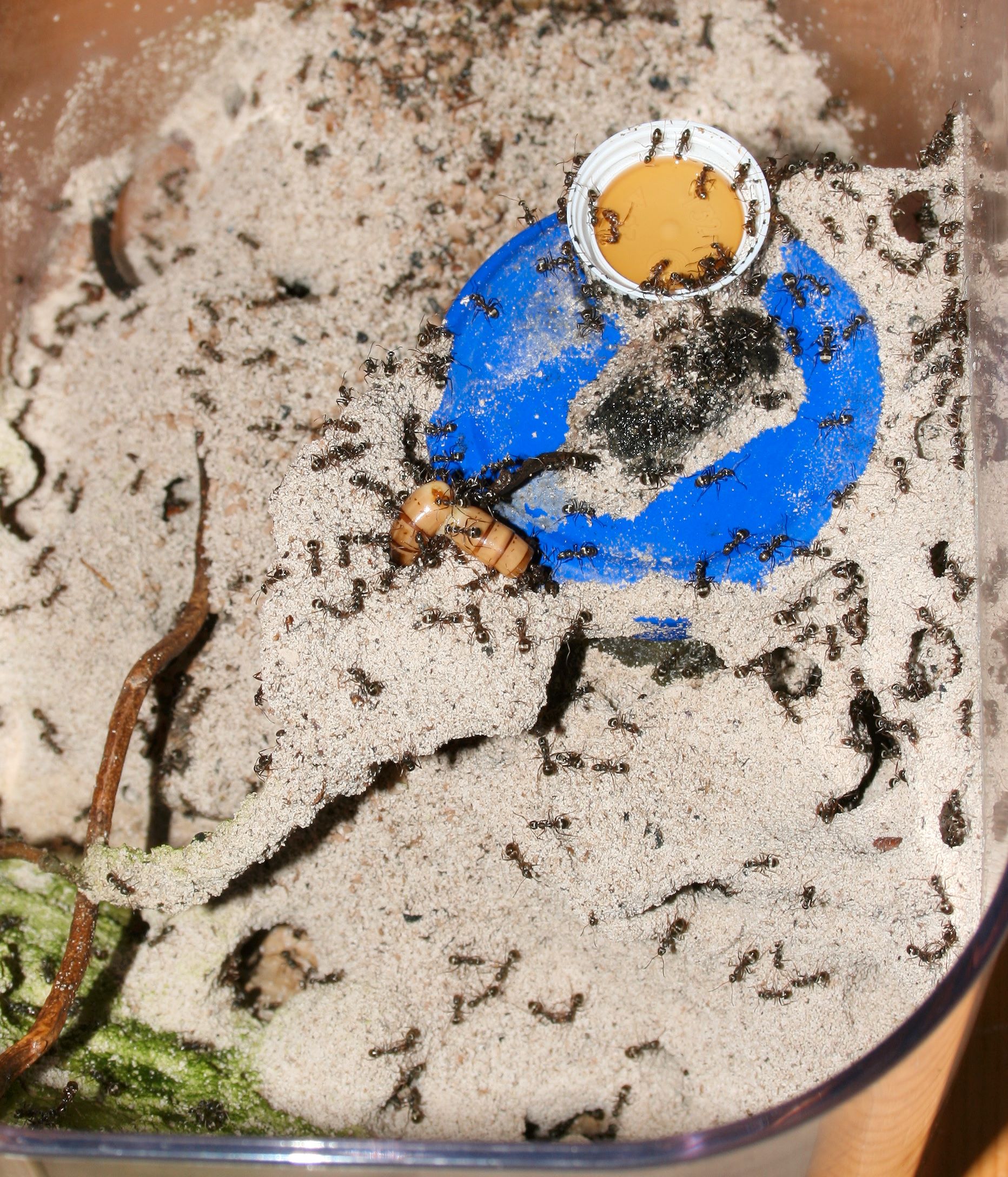 Die Lasius niger lagern jetzt oft über nacht Puppen in einem der RG-Tränken und Larven an der Seite des Formicariums. Tagsüber kommen sie natürlich wieder rein.