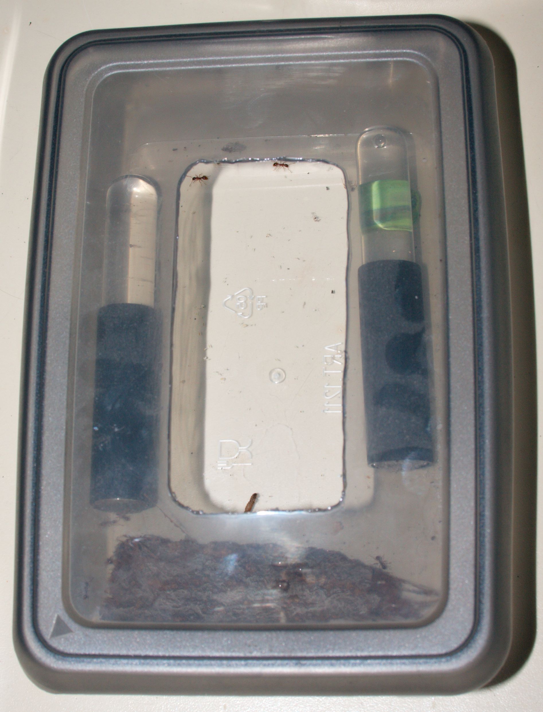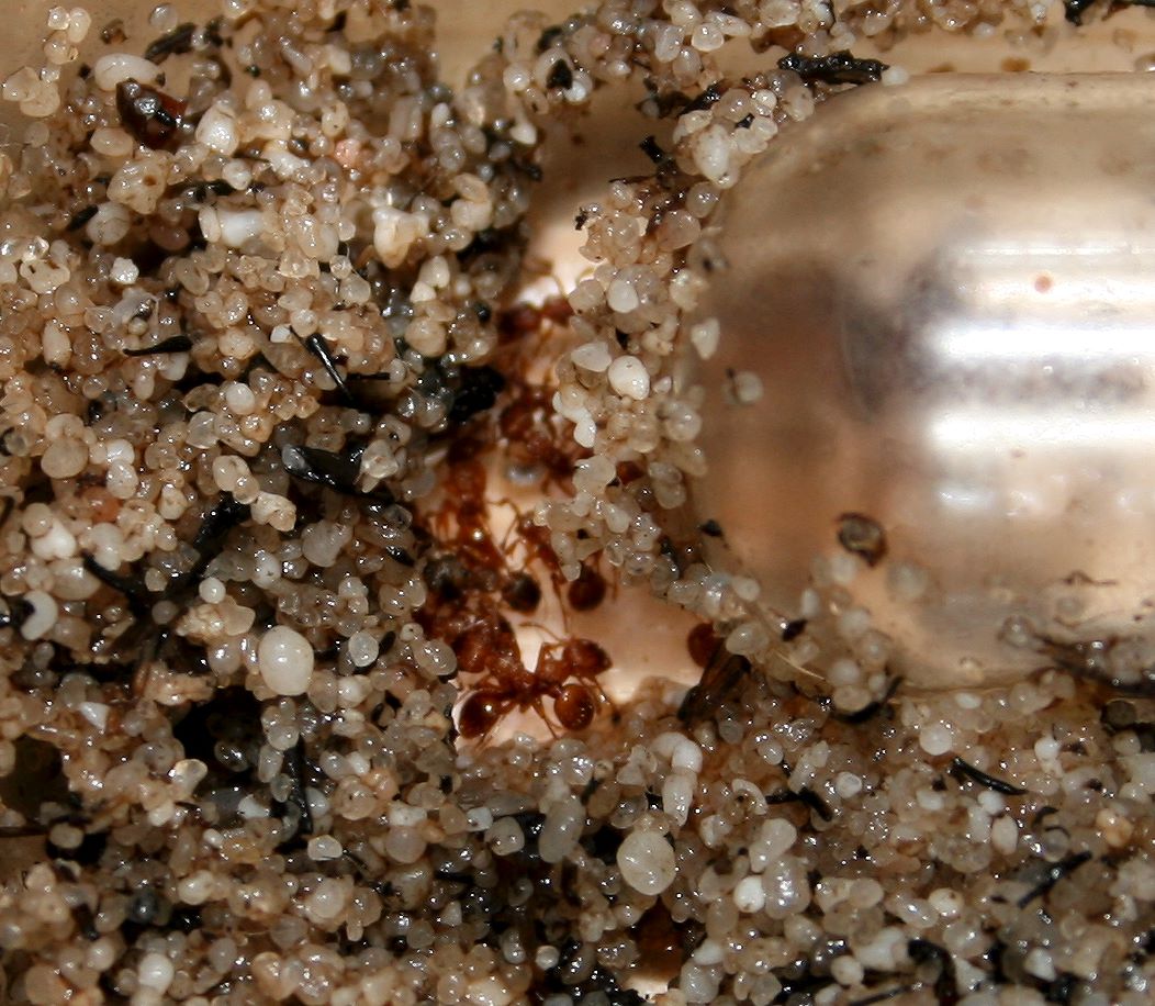 Das zweite ist meine letzte eingesammelte Myrmica rubra Kolonie. Bei der kann ich schon noch Arbeiter beim furagieren beobachen, aber in dem RG-Nest, in das ich sie inzwischen umquartiert habe, kann ich leider keinerlei Brut erkennen.