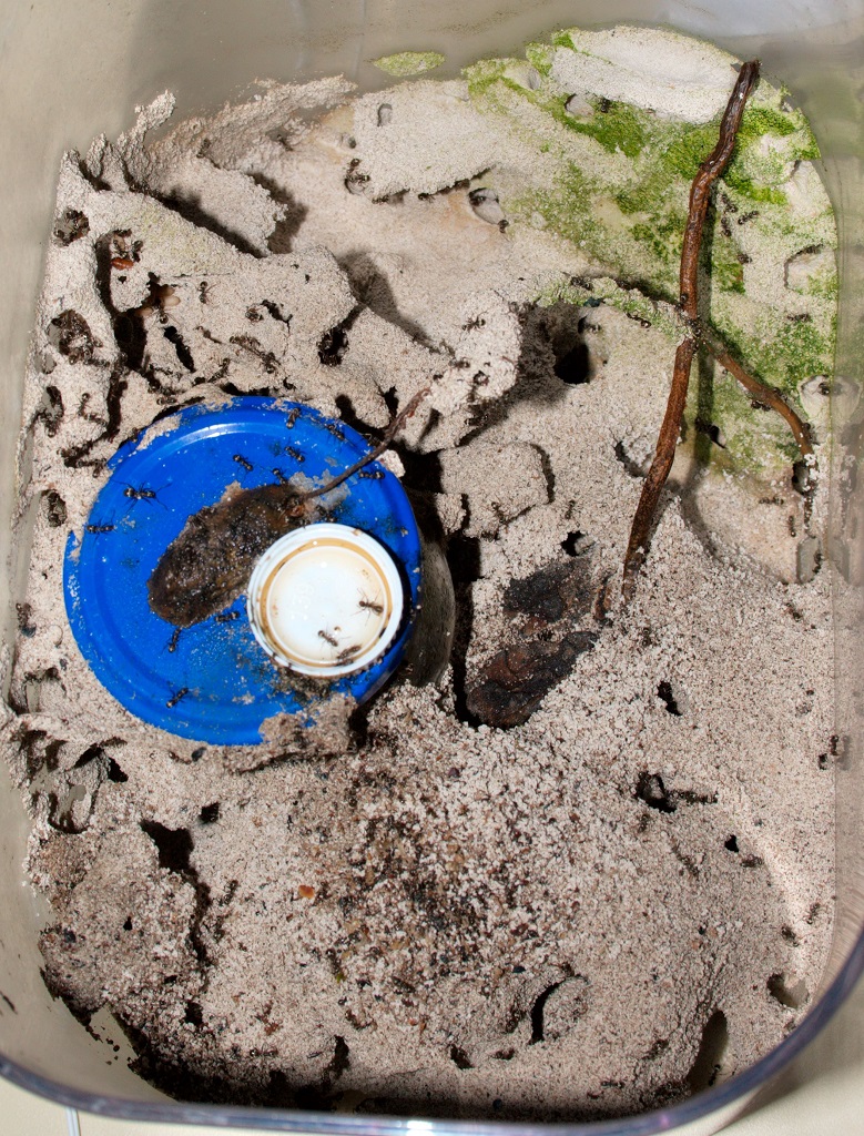 Den anderen Myrmica-Völkern geht es gut, gerade die mit der Single-Gyne im Erdnest scheinen sich prächtig zu entwickeln. Gebaut wird auch andauernd, der Boden gleicht einem Sieb.