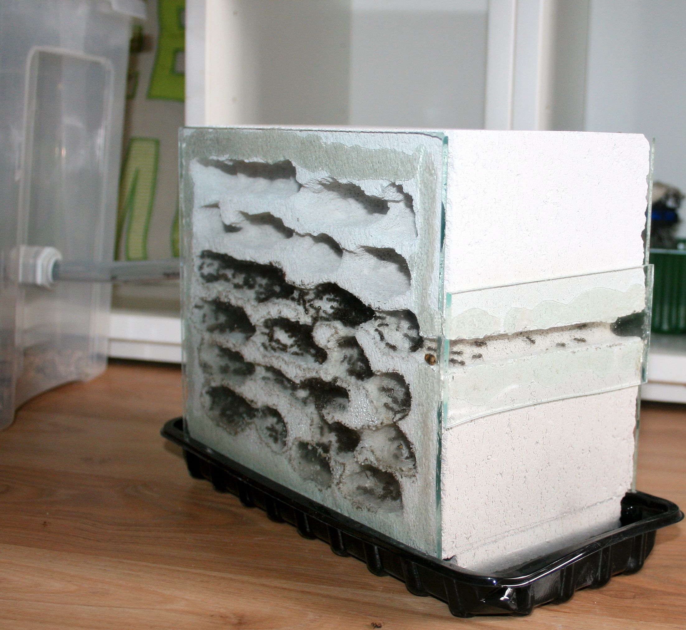 Das Becken wurde gereinigt, Das Nest selbst habe ich mal auseinander gebrochen, damit man sieht, wie die Ameisen dort die Gänge noch erweitert haben.
