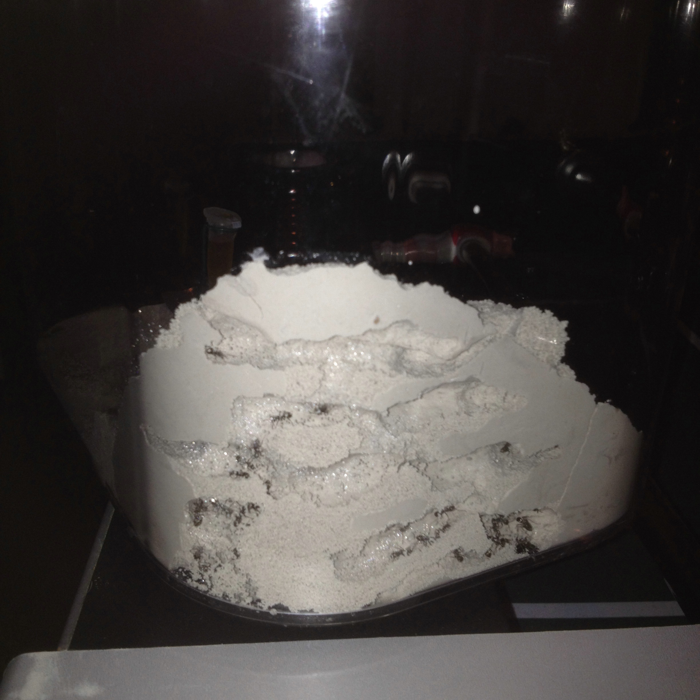 Das Nest wurde ja einfach in die Ecke der Box gegossen und die Gänge in diesem Fall eingefräst (bei den Formica wurden die Kammern mit Knetmasse angelegt), aber aufgrund des Schwundes hat es sich wohl leicht gekrümmt und lag nicht mehr ganz plan auf.