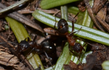 Ich habe zudem eine Gyne im unmittelbaren Nestbereich (3m) gefunden,fotographiert und freigelassen. Die Gyne lief unbehelligt neben ein paar fourangierenden Arbeiterinnen umher. Die " Verteidigungshaltung" der Ameisen konnte ich auch mehr oder weniger gut festhalten, mit Säure wurde ich dieses mal allerdings nicht attackiert.