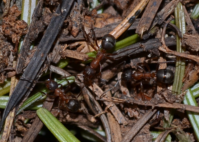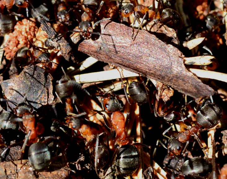 Auf dem 2. Bild sind deutlich Kiefernnadeln zu sehen. Wenn die Tiere in der Lage sind, sie von einer Kiefer zu ihrem Nest zu transportieren, können sie die Bäume auch zur Suche nach Honigtau belaufen.