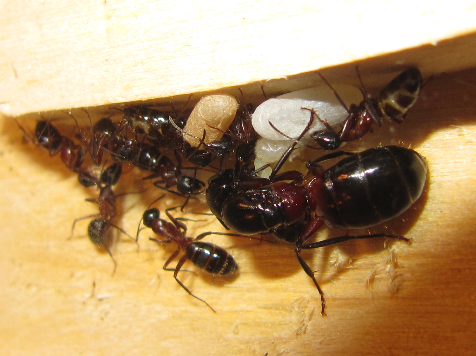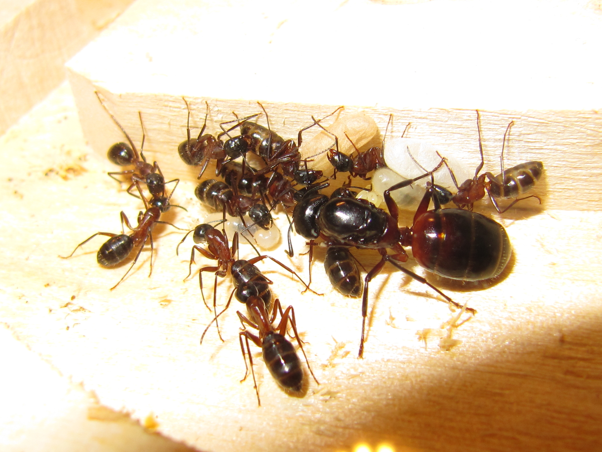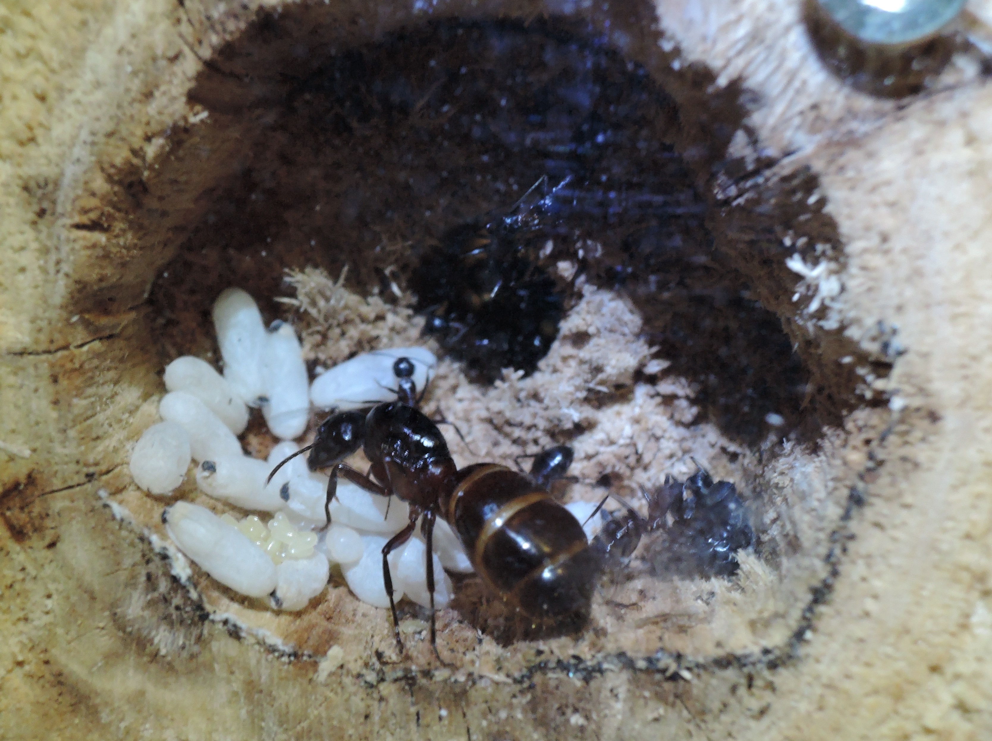 Was mir noch aufgefallen ist: Camponotus ligniperdus stellen immer "Wachposten" beim Nesteingang und an den Kammerneingängen mit Brut und Königin auf.