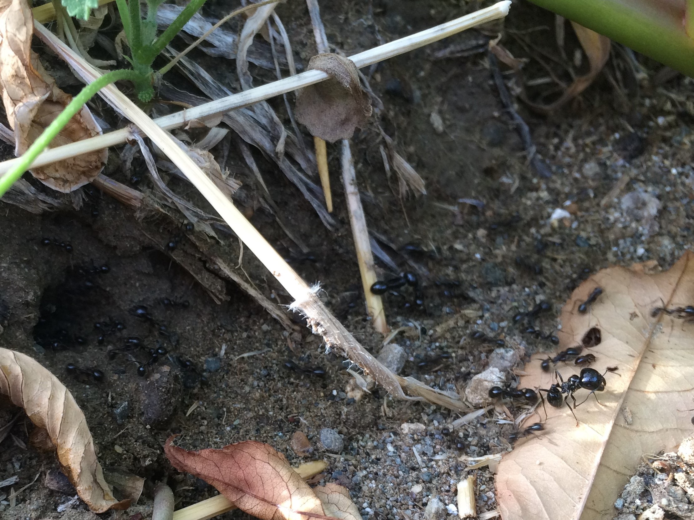 1. Die erste Spezies hat lange Ameisenstraßen über die Terrasse gebildet. Auf dem zweiten Bild ist eine Königin beim Umzug sehen.