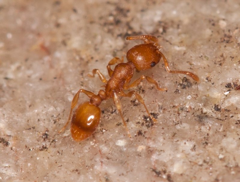 heute fand ich diese kleine Myrmicinae auf einem Stein in einem Kiefern-Eichen-Hangwald. Nachdem sie kurz unter dem Stein verschwand, dachte ich, sie beim Umdrehen wieder entdeckt zu haben - nun gehe ich aber davon aus, daß da noch eine andere Ameise war. Die werde ich daher extra zeigen. Leider gibt es dann auch nur diese eine Perspektive.