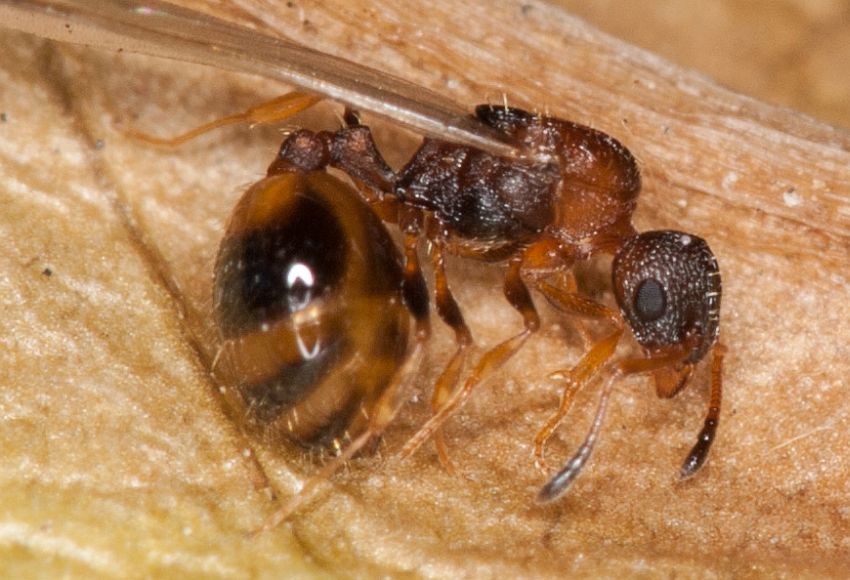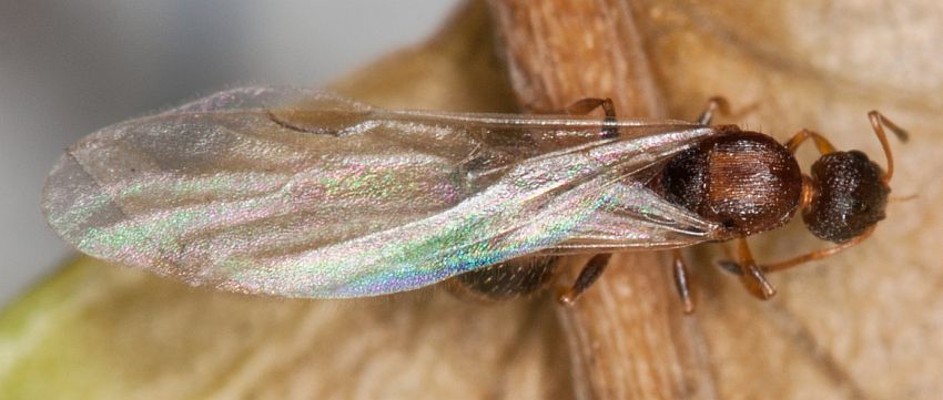 Die Bestimmung ist selbst unter dem Präpariermikroskop bei 50x nicht völlig sicher. Ich kam auf Temnothorax nylanderi. Sowohl T. affinis als auch T. nylanderi leben bei mir im Garten, und auch T. unifasciatus.