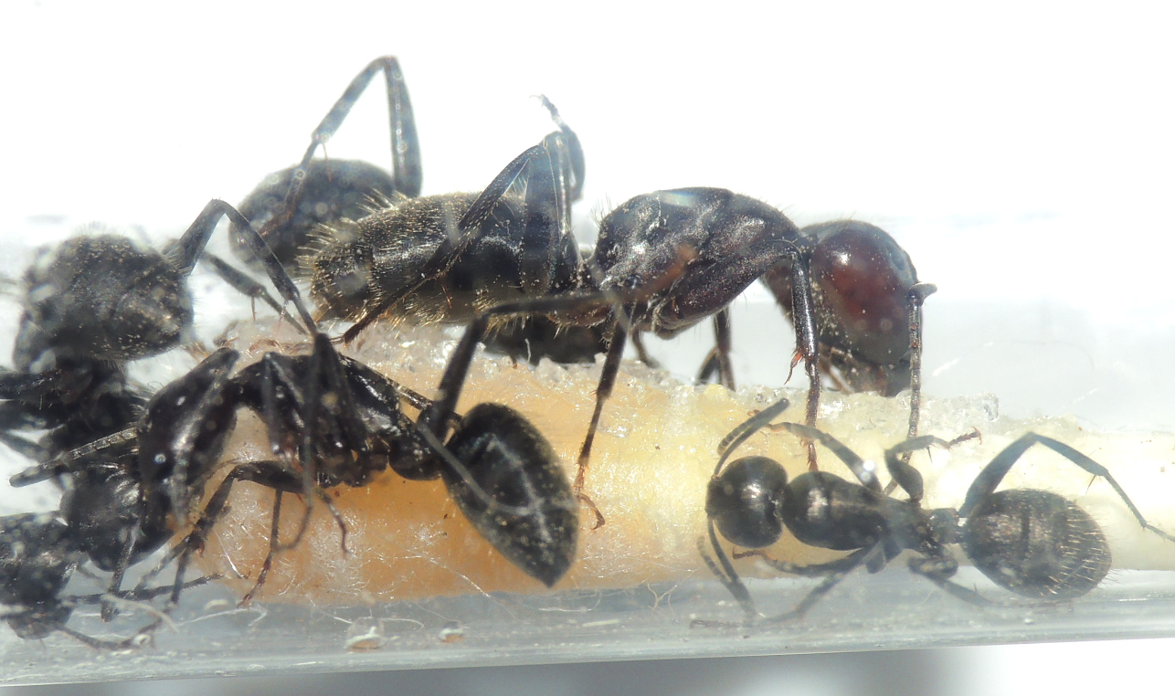 Ein Nest besuche ich regelmäßig an den Wochenenden und suche nach den rotköpfigen Major Arbeiterinnen. Heute, 21.07.2023 war ich fündig und nahm die rotköpfige + ein Dutzend Arbeiterinnen mit, um diese im Reagenzglas weiter zu beobachten. Leider habe ich das rotköpfige Tier beim Einsammeln etwas verletzt. Sie scheint aber auch generell etwas geschwächt zu sein und wackelt mit den Beinen. Zuckerwasser nimmt sie normal auf.