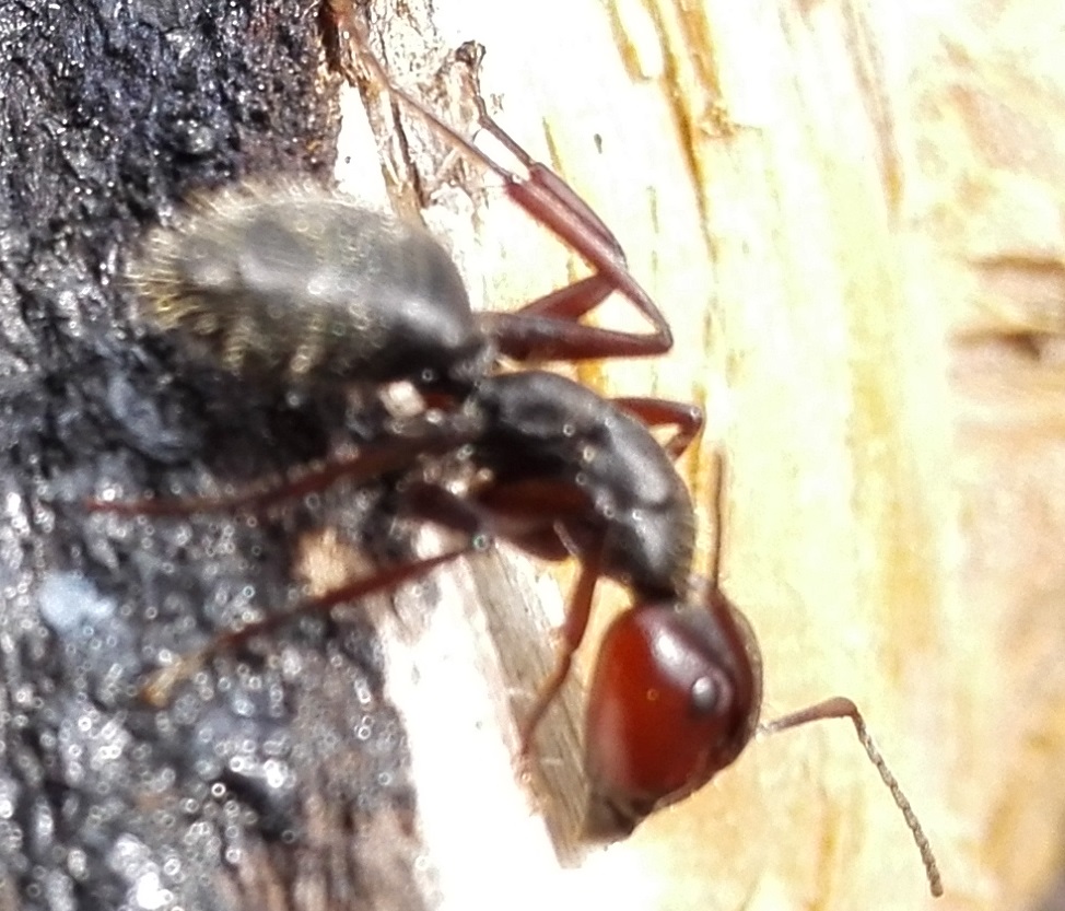 Also was ich meiner Meinung nach ausschließen kann, dass es sich um Jungtiere handelt. Die Farbvariante mit dem roten Kopf ist mir bisher nur bei den richtig großen Major- Arbeiterinnen aufgefallen. So richtig schön rot wie auf den Bildern war nur diese eine Ameise, bei den anderen muss man schon genauer hin schauen, aber wenn man sie ins Licht hält sieht man eindeutig das Dunkelrot. Die Kolonie lebt in einem Holz, welches kontaminiert ist, ich schätze so ähnlich wie bei Eisenbahnschwellen. Dass das der Grund sein könnte...