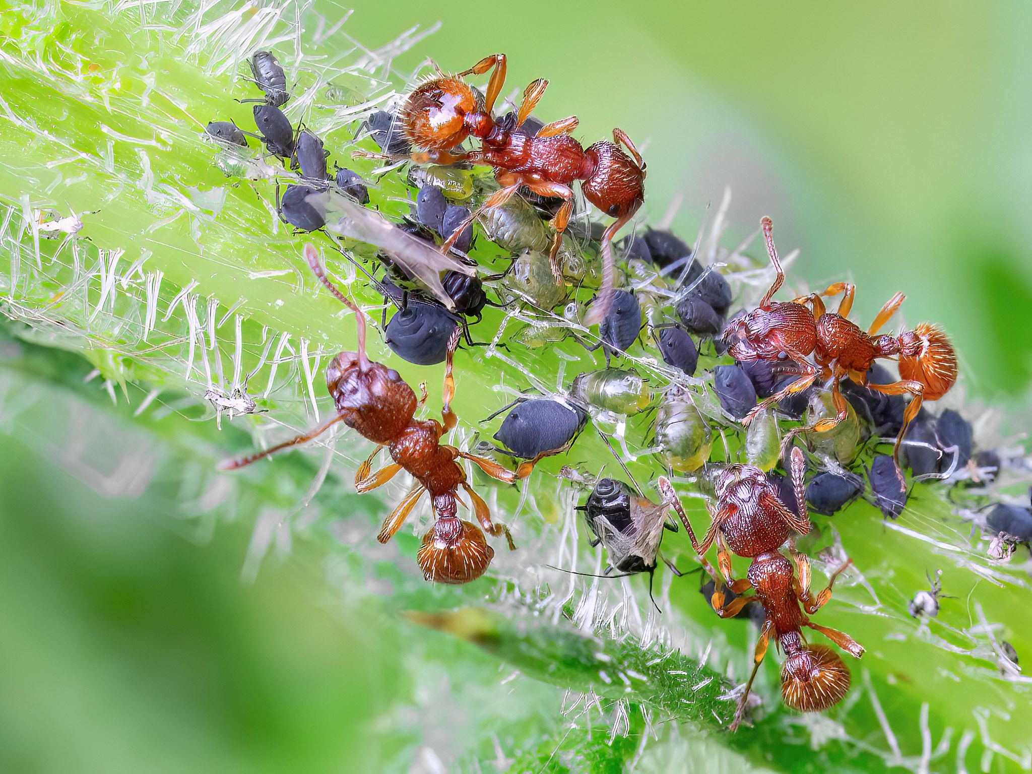 ich habe heute im Garten an Acker-Kratzdistel diese schönen Ameisen beim Läusemelken beobachtet. Die Größe betrug 5 mm (gemessen) und ich vermute Myrmica rubra. Liege ich damit richtig?