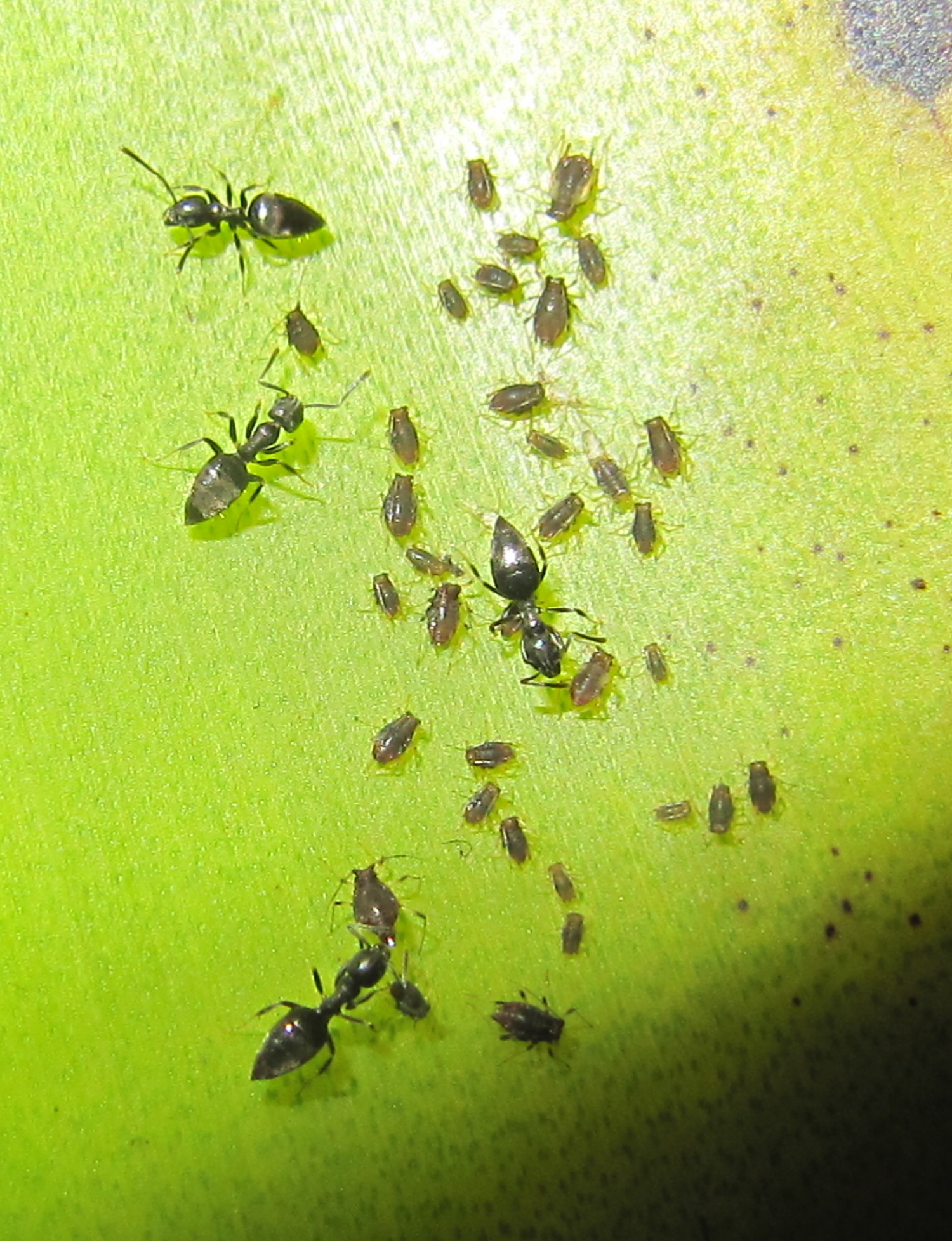 Anbei sind mehr schlechte als rechte Fotos einer ca. 3 mm langen Ameise aus dem Madagaskarhaus im Zoo Zürich. Sie scheinen kleiner als Lasius niger und die Gaster läuft spitzer zu. Die Ameisen sind, einmal entdeckt, in der ganzen Anlage unterwegs. Mitunter bilden sie lange und mehrere cm breite Strassen auf Palmen und Bäumen, an denen sie Blattläuse besuchen. Zum Teil überdachen sie die Kolonien.