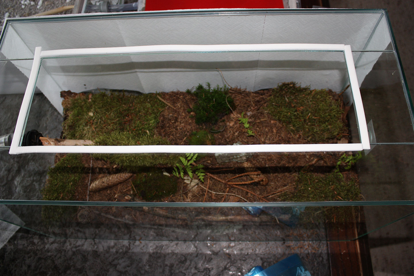 Ich fülle jetzt das Glasrahmenbecken mit Walderde. Möglichst nur 2 bis 3 ca. Hoch, damit will ich den Nestbau in der Arena verhindern.