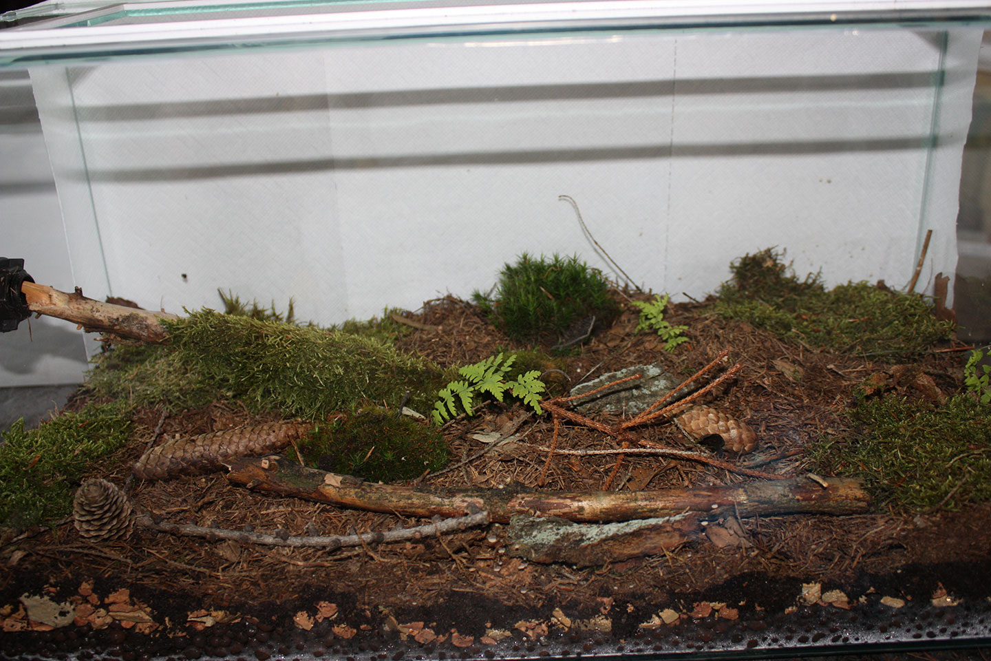 Als nächstes setzte ich die Farne oder ähnliche Pflanzen ein. Man sollte die Arena nicht zu dicht bepflanzen da man sonnst ein schlechteren Einblick hat. Anschließend befülle ich es mit einer 1-2 cm hohen Waldstreu Schicht.