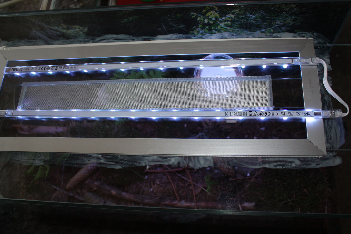 Ich habe mir auch noch eine schicke RGB LED Lichtleiste gegönnt, Ich werde sie erst mal nur lose auf den Deckel legen später fällt mir bestimmt noch was Besseres ein. Wie der Name RGB schon sagt kann man 7 Farbkombinationen einschalten, dazu später mehr.