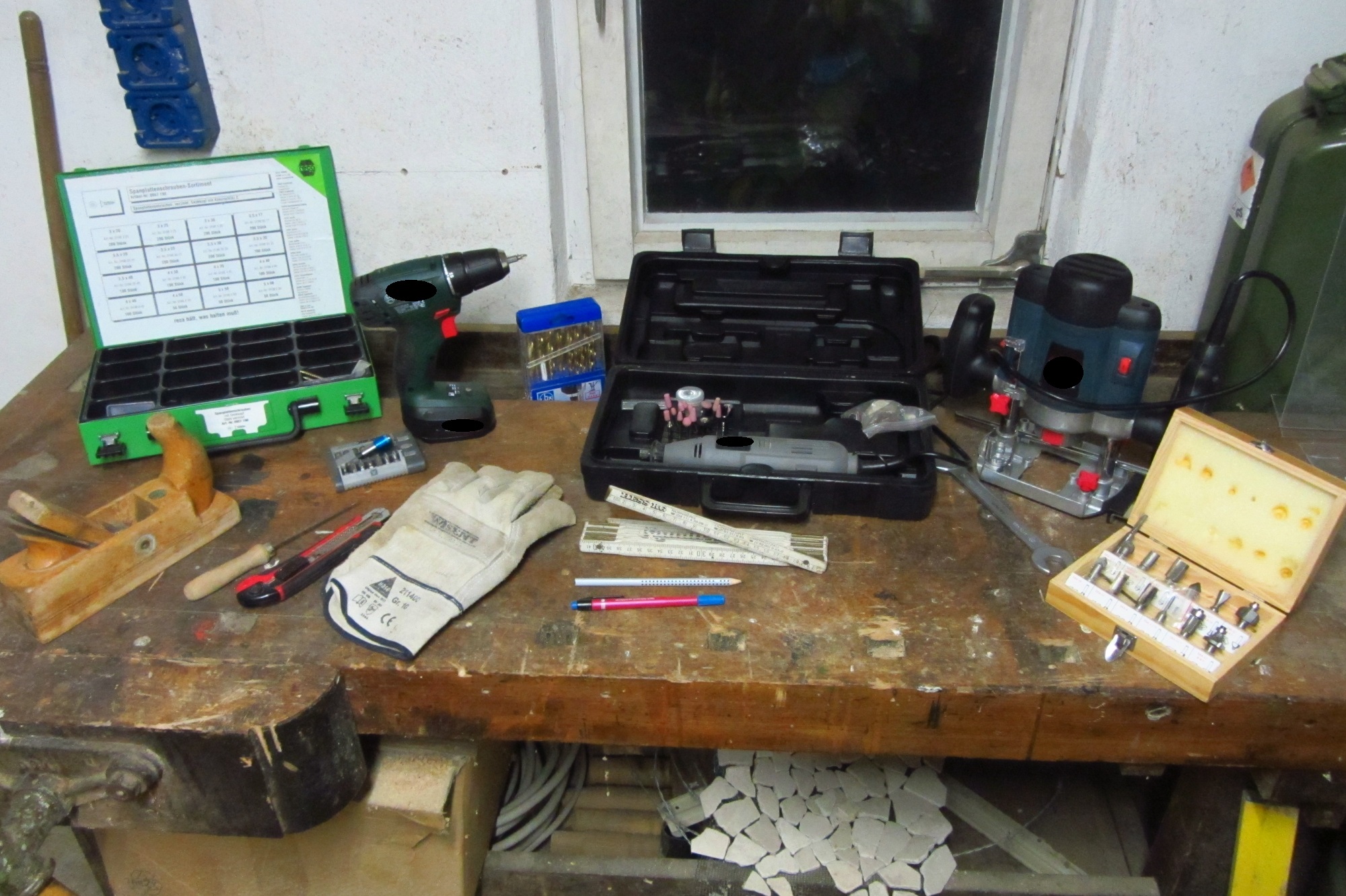 Nun das verwendete Werkzeug in der Zusammenschau. Hab zwar die Markennamen geschwärzt, bringt aber kaum was xD. Die Säulenbohrmaschine, mit der ich die Bohrungen für das Plexiglas, das Nestteil und zum Versenken der Schrauben vorgenommen habe, steht im anderen Raum, ist auf dem Foto also nicht mit von der Partie.