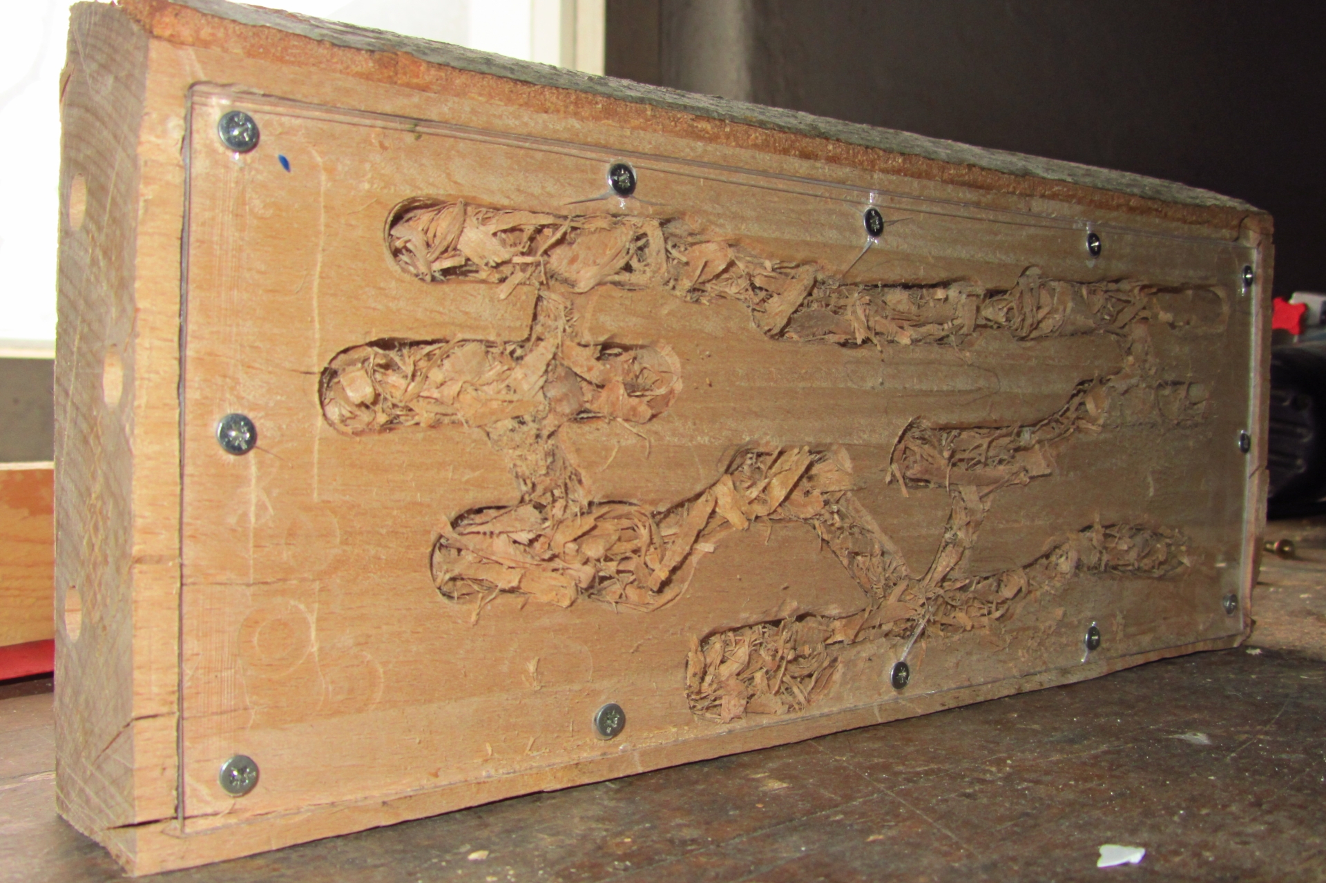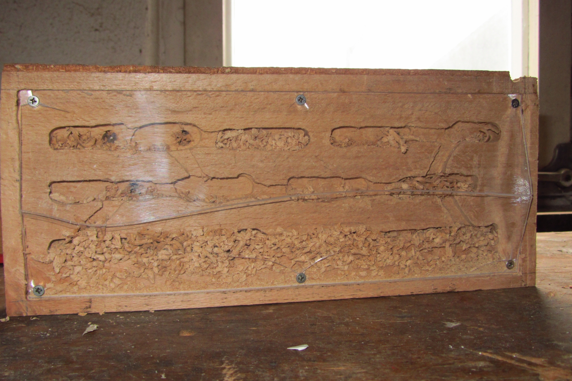 ... nämlich ein paar Kammern und Gänge frei Schnauze eingefräst. Die Feinarbeit wird dann mittels Dremel gezaubert, aber das wird in den kommenden Tagen erledigt. Dann gibt es noch ein Foto mit Metermaß daneben, sodass die Größenverhältnisse ersichtlich werden. Übrigens: die Gänge werden am Ende mit grobem Holzabfall (den Abfall also nicht einfach wegwerfen!) wieder aufgefüllt, die Glasscheibe aufgesetzt und die nächste Gyne vor einen der Eingänge (noch nicht definitiv festgelegt, befinden sich aber in Planung) gedonnert. Aber das werde ich in einem der nächsten Beiträge zeigen.
