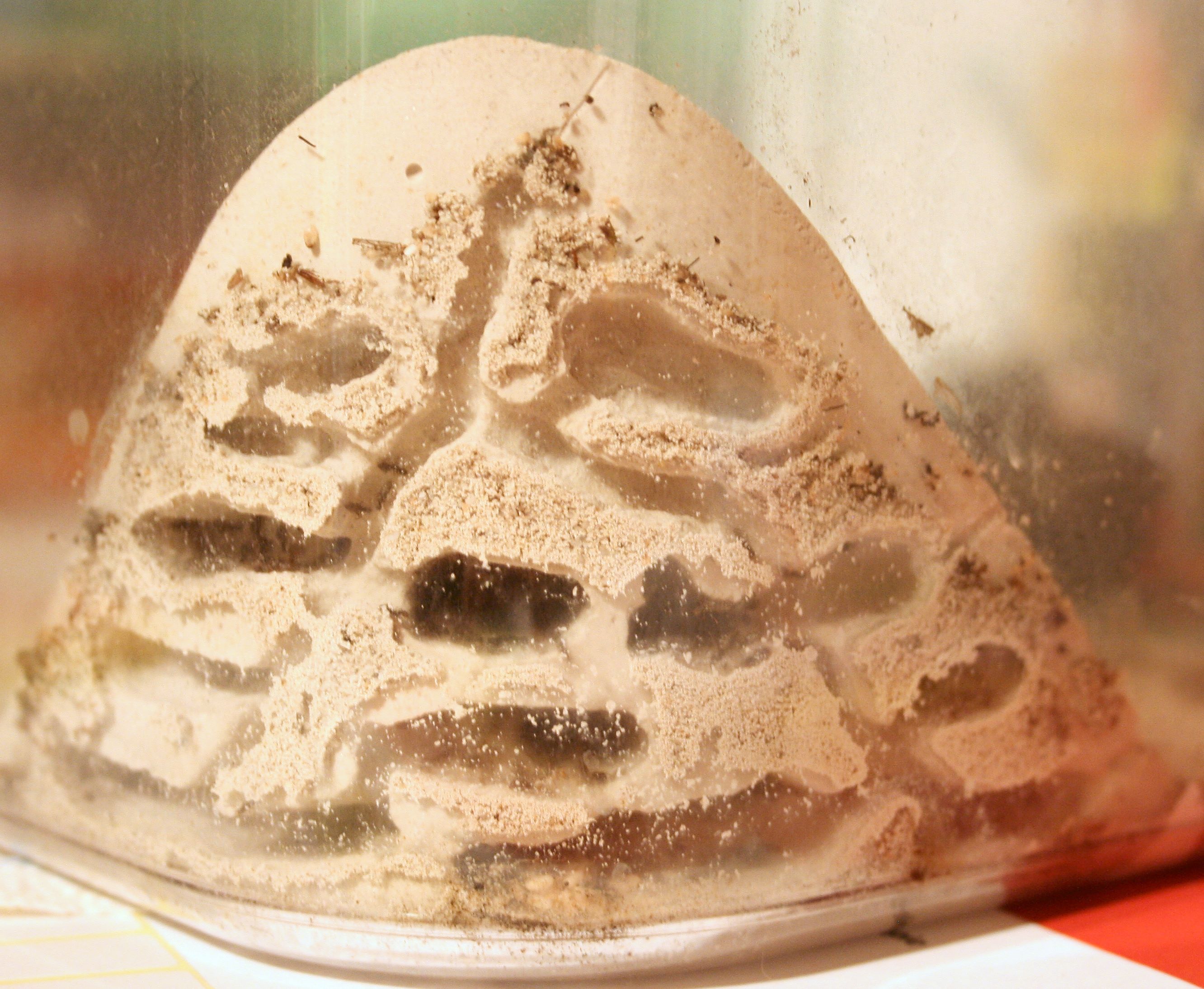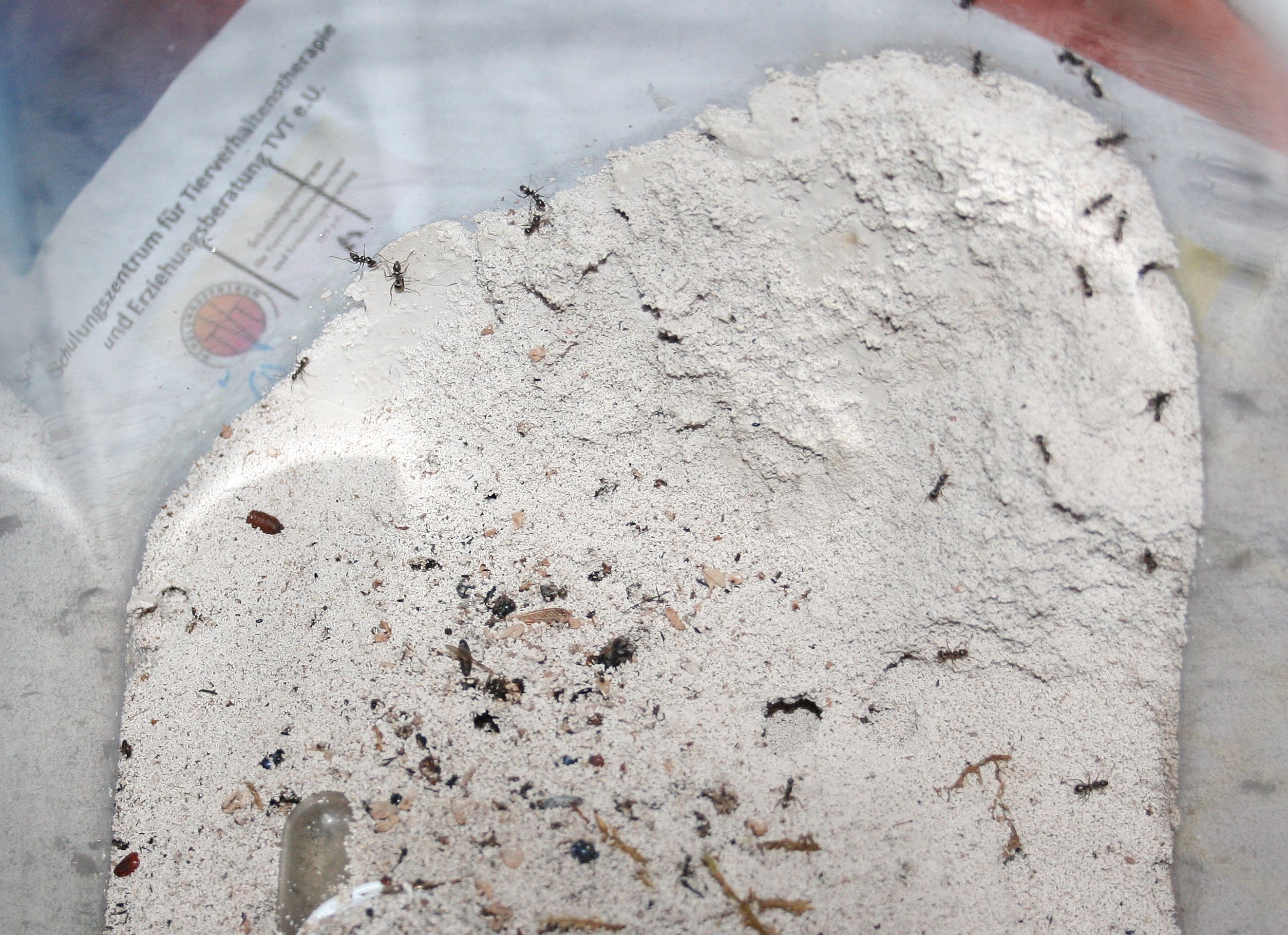 Die beiden Nester sind nun schon einige Zeit im Einsatz und man sieht es ihnen teilweise schon sehr an. Während das der Lasius niger noch beinahe so aussieht, wie ich es gebaut habe, kann man das von dem der Formica cunicularia nicht mehr sagen. Das der Formica war übrigens das erste. Der Gips ist generell recht weich und kann durch die Ameisen bearbeitet werden. Es war Stuck- und Modelliergips. Jetzt hab ich Elektrikergips, der scheint härter zu sein.