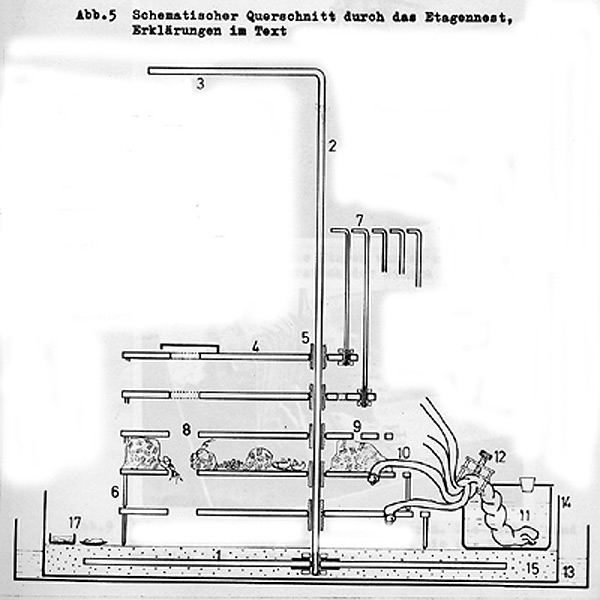 13 ist eine große Wanne mit Wasser als 2. Ausbruchsschutz. Darin steht 14: Eine Blechwanne von 50 x 50 cm mit 10 cm hohem Rand (mit Paraffinöl gesichert). Darin ist in Gips (15) eine Fußplatte (1) eingegossen, in die ein Metall - „Galgen“ eingeschraubt ist. Die Etagen bestehen aus Kunststoffplatten von 20 x 20 cm Größe, die an einer Seite durchbohrt waren, so dass man sie auf die Metallstange aufschieben und daran schwenken konnte. Usw.; ich denke, das Wesentliche ist der Zeichnung zu entnehmen.