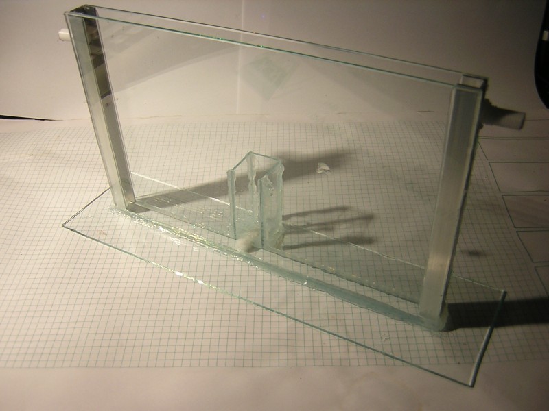 Hier habe ich eine Wassertank-Lösung versucht in der ein Aquarium(ohne Bohrungen) den Wassertank bildet und sowohl ein trockener als auch ein feuchter Nestbereich entsteht.