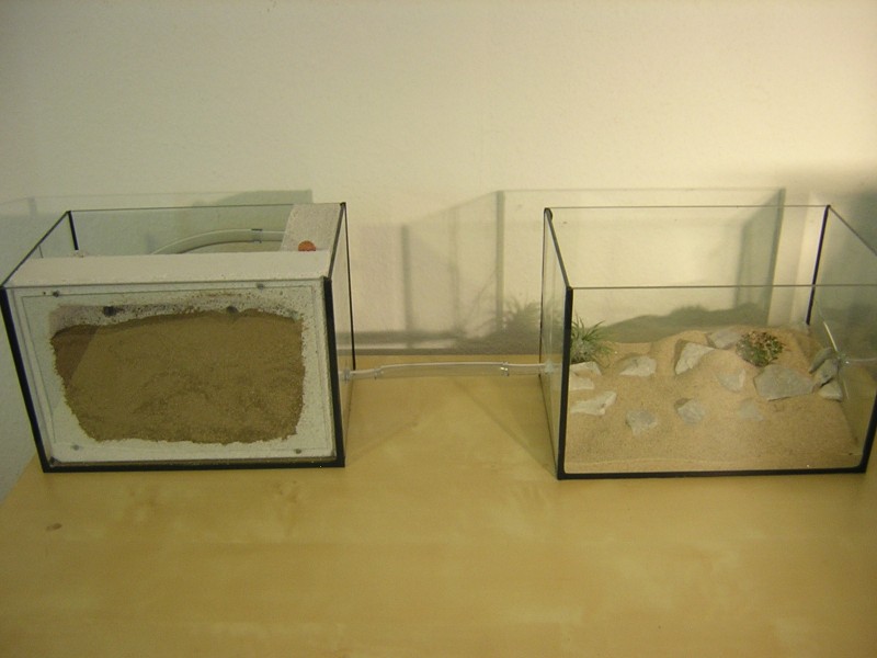 Hier habe ich eine Wassertank-Lösung versucht in der ein Aquarium(mit Bohrungen an der Seitenscheibe) den Wassertank bildet und sowohl ein trockener als auch ein feuchter Nestbereich entsteht.