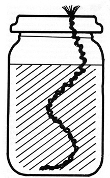 Tränke aus z. B. Marmeladenglas mit Loch im Schraubdeckel, durch das ein Wollfaden geführt ist.