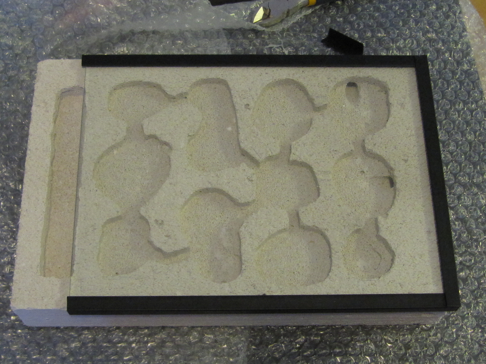 Sobald der Stein trocken ist, wird die sauber geputzte Scheibe direkt mit Aquariensilikon auf den Stein geklebt. Das Silikon bringe ich nur an 3 Seiten an. Auf Seite Wassertank lasse ich zwecks „Belüftung“ offen. Aussen bringe ich ebenfalls mit Silikon die schwarzen Winkelleisten aus Plastik an, die einerseits die Schnittkanten abdecken, andererseits Scheibe und Stein zusätzlich verkleben. Bisher hatte ich nie Probleme wegen schlechter Haftung, liegende Nester müssen diesbezüglich aber auch wenig Druck aushalten. Genauso wie bei den Schläuchen, raue ich das Material etwas an, bevor ich es verklebe. Dann wird das Ganze beschwert und für einige Tage trocknen gelassen. Fertig!