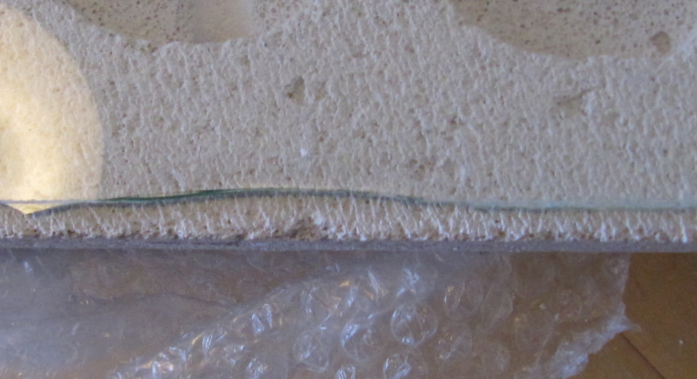 Während der Stein trocknet, kann man sich an die Bearbeitung der Glasscheibe machen: Grösse einmessen, Winkel platzieren und die Scheibe direkt mit dem Glasschneider einritzen. Den Glasschneider hält man dabei senkrecht und zieht das Schneiderädchen mit etwas Druck (nicht zu hart) entlang dem Winkel von Kante zu Kante. Dann kann man das Glas mit etwas Druck mit blossen Händen brechen (Handschuhe und Schutzbrille können nicht schaden!). Eigentlich sollte man den Glasschneider und die Glasoberfläche mit etwas Schneideflüssigkeit ölen. Die hatte ich aber nicht zur Hand und der Bruch ist entsprechend schlecht geworden. Macht aber nichts, da ich die scharfe Schnittstelle sowieso mit einem Winkel abdecke.