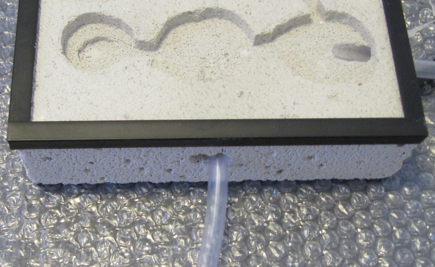 Als nächstes werden die Kammern und Gänge angezeichnet. Ich mache das immer nur ungefähr, aber man kann sich selbstverständlich auch genau an den Plan halten und entsprechende Muster einmessen. Die Kammern können mit der Dremel (schon wieder ein eingebürgerter Markenname) und entsprechenden Aufsatz eingefräst werden. Sie lassen sich aber auch ohne grosse Mühe mit einem Stechbeitel oder einem alten Schraubenzieher ausstechen/einritzen. Man muss nur darauf achten, dass der Ytong nicht zu dünn ist, da man beim Bearbeiten der Kammern sonst durchbrechen kann. Bei einer Kammertiefe von 1 – 2 cm ist ein 5 cm starker Stein ideal. Wenn man die Dremel nicht auf Hochtouren laufen lässt, hält sich die Stauberei in Grenzen. Von Zeit zu Zeit kommt der Staubsauger zum Einsatz. Im Freien kann man den Stein einfach „ausklopfen“. Sobald Kammern und Wassertank eingearbeitet sind, werden mit einen Metallbohrer die Löcher für die Verbindungsschläuche gebohrt.