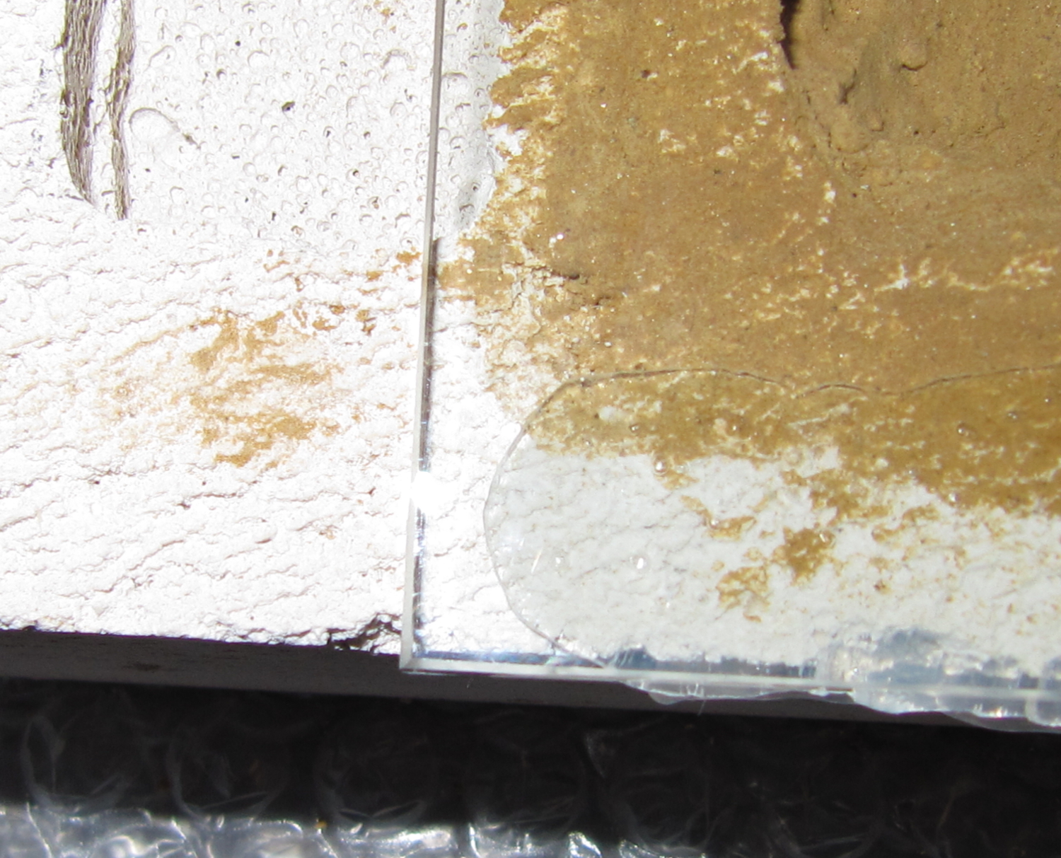 Bei diesem Nest habe ich noch etwas (für mich) neues versucht und die Kammern mit einer Lehmmischung ausgestrichen. Mit dem Winkel streiche ich das Gemisch glatt, damit die Scheibe sauber aufliegen kann. Die Ränder bleiben frei, damit das Silikon besser haftet.