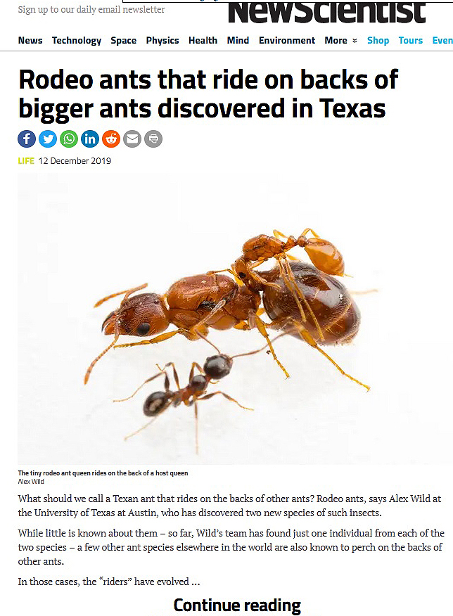 Was sollten wir ein Texaner Ameise, dass Fahrten auf dem Rücken der anderen Ameisen nennen? Rodeo Ameisen, sagt Alex Wilde an der University of Texas in Austin, der zwei neue Arten solcher Insekten entdeckt hat. Während wenig über sie bekannt ist, so weit hat Wilds Team nur eine Person aus jedem der beiden Arten ein paar andere Ameisenart anderswo in der Welt sind auch bekannt, Barsch auf dem Rücken der anderen Ameisen gefunden.