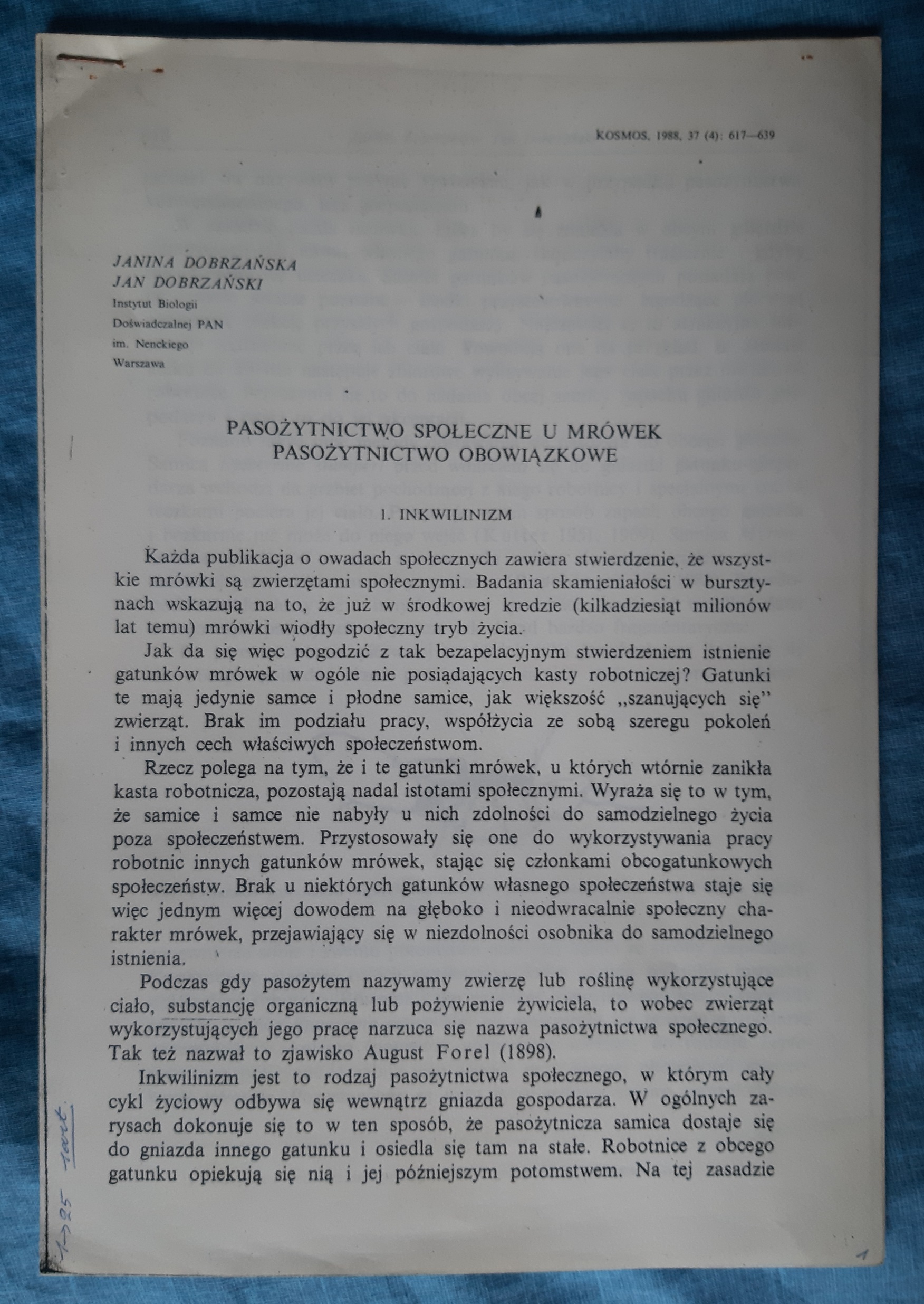 Dobrzanska, J. & Dobrzanski, J., 1988, “Pasozytnictwo spoleczne u mrowek. Pasozytnictwo obowiazkowe.”, or “[Social parasitism in ants. Obligatory parasitism.]” Kosmos, vol. 37, nr. 4: 617-639.