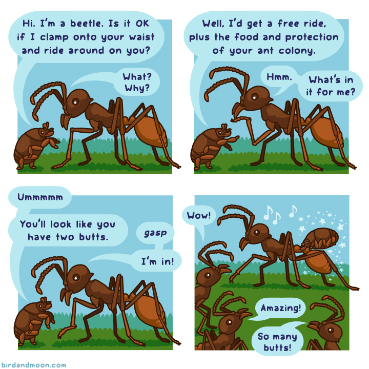 Emse hat geschrieben:Über einen kleinen und sehr anhänglichen Käfer:Forscher der Technischen Universität Darmstadt und des National Museum of Natural History, Washington D.C., haben im Rahmen einer Biodiversitätsstudie eine neue Käferart entdeckt: Nymphister kronaueri lässt sich auf dem Rücken von Treiberameisen transportieren und sieht dabei deren Hinterteil täuschend ähnlich. Die in der Fachzeitschrift BMC Zoology veröffentlichte Studie zeigt, dass sich die neue Art mit ihren kräftigen Mandibeln an den Ameisen festhakt, und sich auf diese Weise gleichsam per Anhalter zum neuen Nistplatz der Ameisen transportieren lässt. [..]