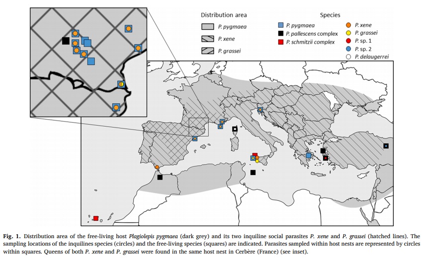 Plagiolepis ABSTRACT: Social parasitism, i.e. the parasitic dependence of a social species on another free-living social species, is one of the most intriguing phenomena in social insects. It has evolved to various levels, the most extreme form being inquiline social parasites which have lost the worker caste, and produce only male and female sexual offspring that are reared by the host worker force. The inquiline syndrome has been reported in 4 species within the ant genus Plagiolepis, in Europe. Whether inquiline social parasitism evolved once or multiple times within the genus remains however unknown. To address this question, we generated data for 5 inquiline social parasites – 3 species previously described and 2 unidentified species – and their free-living hosts from Europe, and we inferred their phylogenetic relationships. We tested Emery’s rule, which predicts that inquiline social parasites and their hosts are close relatives. Our results show that inquiline parasitism evolved independently at least 5 times in the genus. Furthermore, we found that all inquilines were associated with one of the descendants of their most related free-living species, suggesting sympatric speciation is the main process leading to the emergence of the parasitic species, consistent with the stricter version of Emery’s rule.
