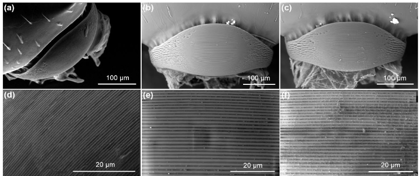 Electron Scan Microscope images of the whole pars stridens and ridges of (a,d) [i]Myrmica karavajevi queens and (b,e) M. scabrinodis queens and (c,f) workers.[/i]