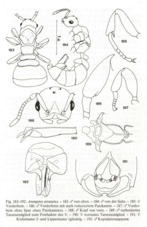Es sind zahlreiche Zeichnungen enthalten. Man muss allerdings auch bedenken, dass die Deutungen den Wissensstand von vor fast 70 Jahren wiedergeben. Zu dieser Zeit hat man den Sozialparasiten eine "parasitische Degeneration" unterstellt. Entsprechend sind alle Beobachtungen, die sich in dieser Richtung deuten ließen, besonders hervorgehoben. - Interessant ist übrigens auch, dass man (S. 118) in der bereits degenerierten Flugmuskulatur Zysten mit eingerollten Nematoden gefunden hat. Darüber ist mir aus späterer Zeit nichts mehr bekannt geworden (sind diese Nematoden regelmäßig in Teleutomyrmex zu finden, auch in den später entdeckten weiteren Populationen? - Es hat wohl niemand danach gesucht!).