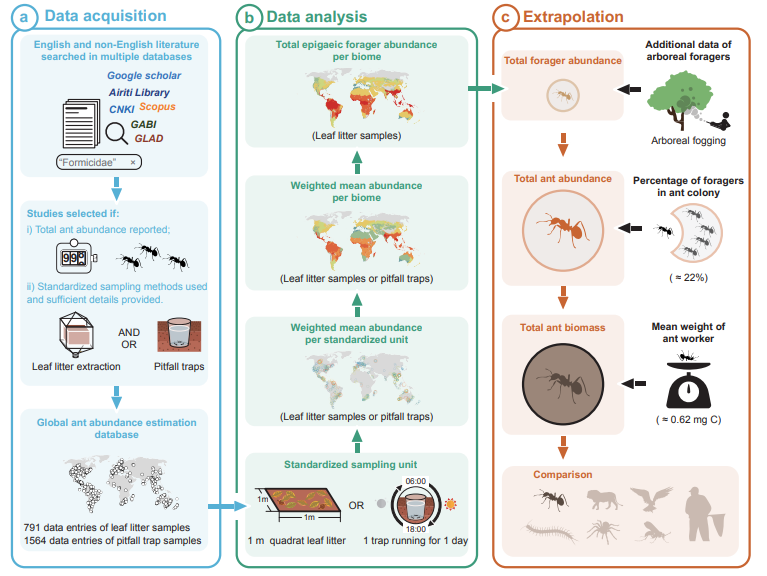 Das ist schwer vergleichbar mit anderen Angaben, wo Biomasse häufig in Trockenmasse (also Kohlenstoff und alle anderen im getrockneten Organismus vorhandenen Elemente) angegeben wird, oder in Frischmasse (also inklusive des darin enthaltenen, beim Trocknen entfernten Wassers).The astounding ubiquity of ants has prompted many naturalists to contemplate their exact number on Earth, but systematic and empirically derived estimates are lacking. Integrating data from all continents and major biomes, we conservatively estimate 20 × 1015 (20 quadrillion) ants on Earth, with a total biomass of 12 megatons of dry carbon.