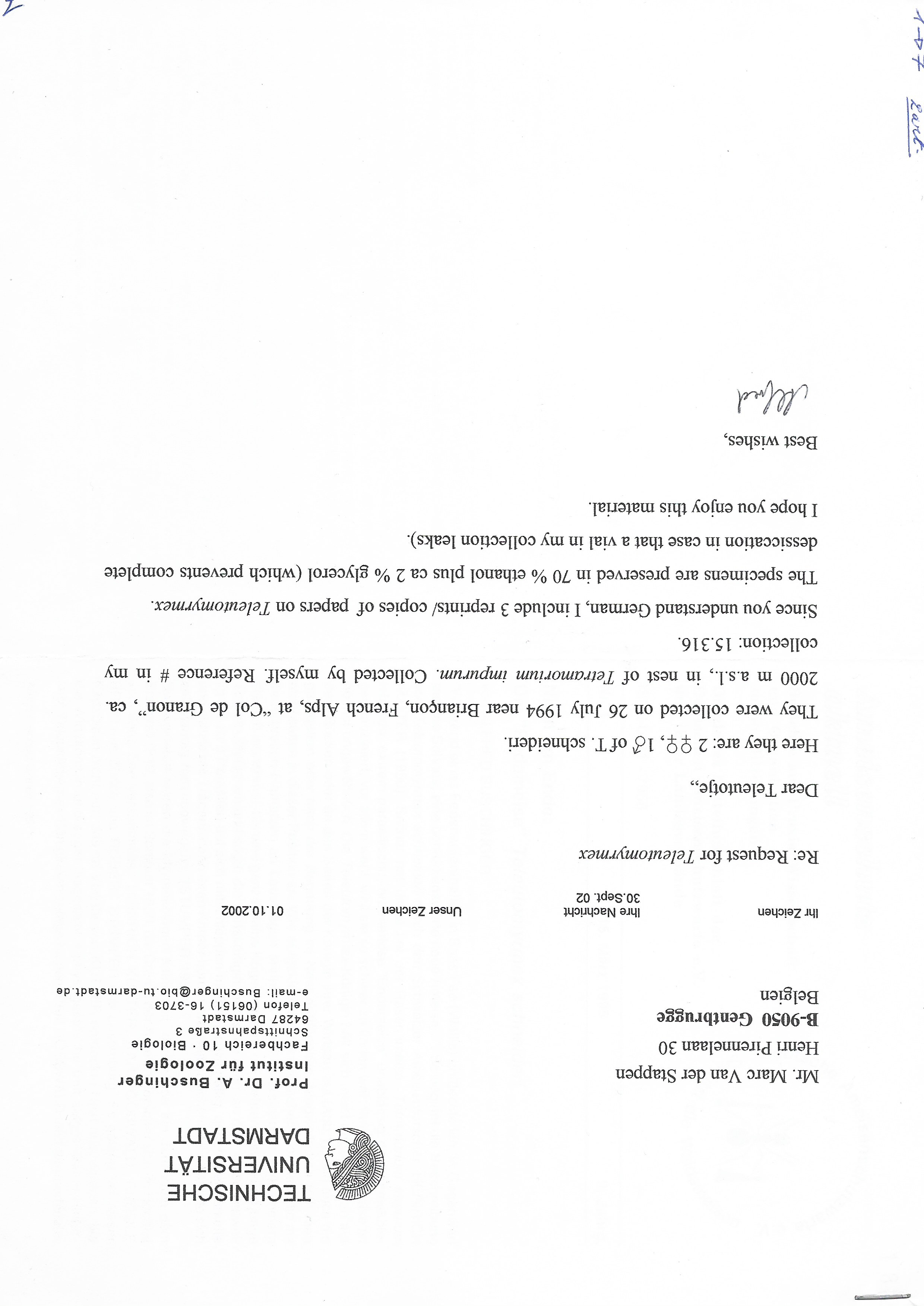 Wegnez, P., Ignace, D., Lommelen, E., Hardy, M., Bogaert, J., Nilsson, C., 2015, “Redécouverte de Teleutomyrmex schneideri Kutter, 1950 dans les Alpes françaises (Hymenoptera: Formicidae).” Bulletin de la Société royale belge d’Entomologie/Bulletin van de Koninklijke Belgische Vereniging voor Entomologie, vol. 151, p. 52-57.