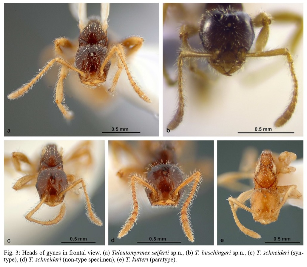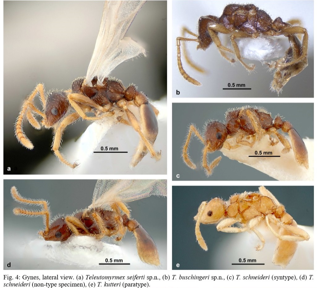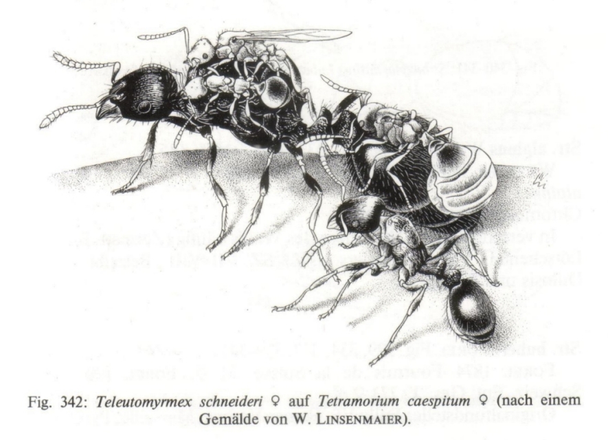 Stumper, R., 1951, “Teleutomyrmex schneideri Kutter (Hym. Formicid.). II. Mitteilung. Über die Lebensweise der neuen Schmarotzerameise.” Mitteilungen der Schweizerischen Entomologischen Gessellschaft, vol. 24, no. 2, p. 129-152.