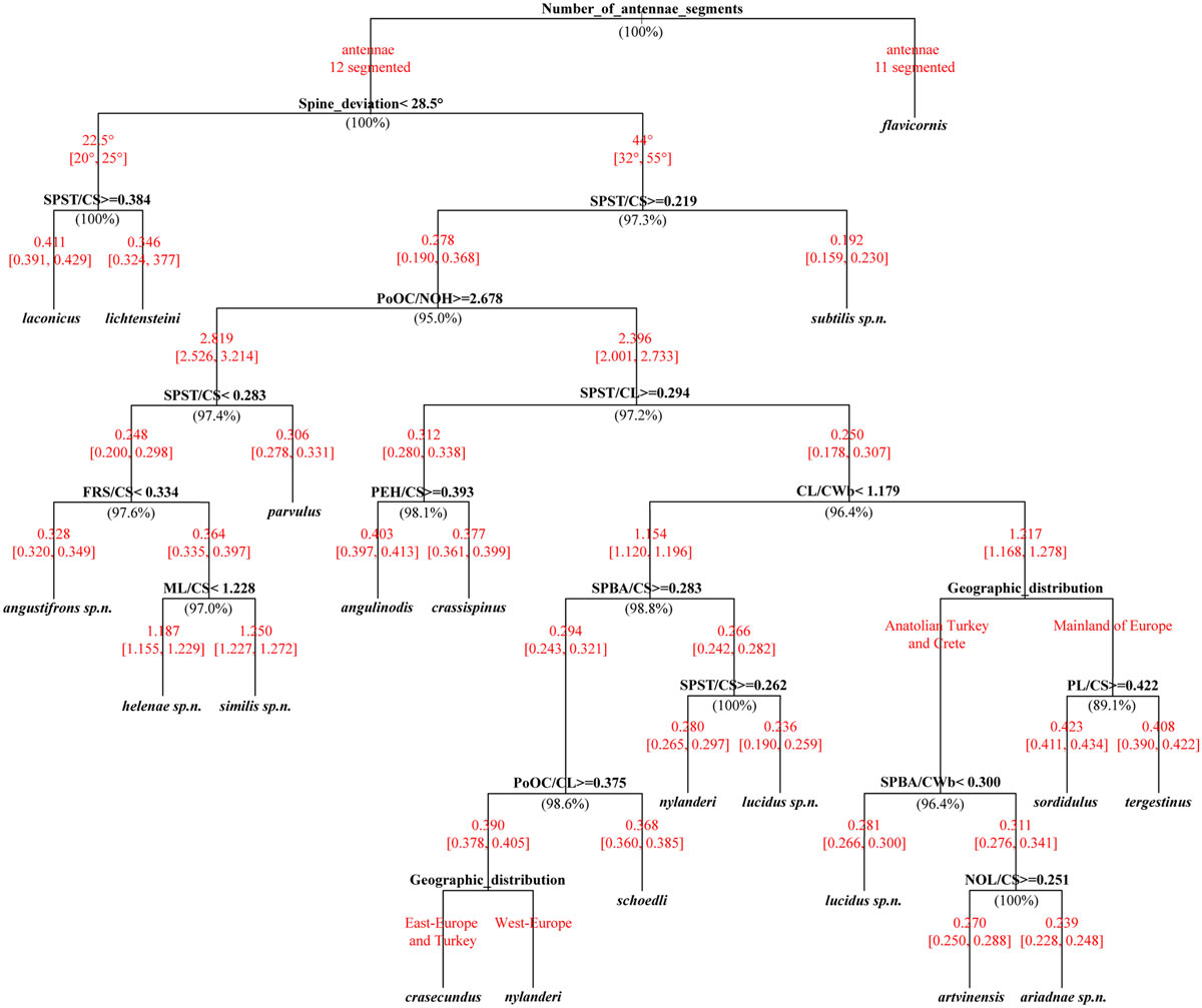 In the current revisionary work, the Temnothorax nylanderi species-group of myrmicine ants is characterized. Eighteen species belonging to this group in the Ponto-Mediterranean region are described or redefined based on an integrative approach that combines exploratory analyses of morphometric data and of a 658bp fragment of the mitochondrial gene for the cytochrome c oxidase subunit I (CO I). The species group is subdivided into five species complexes: T. angustifrons complex, T. lichtensteini complex, T. nylanderi complex, T. parvulus complex, T. sordidulus complex, and two species, T. angulinodis sp. n. and T. flavicornis (Emery, 1870) form their own lineages. We describe seven new species (T. angulinodis sp. n., T. angustifrons sp. n., T. ariadnae sp. n., T. helenae sp. n., T. lucidus sp. n., T. similis sp. n., T. subtilis sp. n.), raise T. tergestinus (FINZI, 1928) stat.n. to species level, and propose a new junior synonymy for T. saxonicus (SEIFERT, 1995) syn.n. (junior synonym of T. tergestinus). We describe the worker caste and provide high quality images and distributional maps for all eighteen species. Furthermore, we provide a decision tree as an alternative identification key that visually gives an overview of this species-group. We make the first application to Formicidae of the Semantic Phenotype approach that has been used in previous taxonomic revisions.
