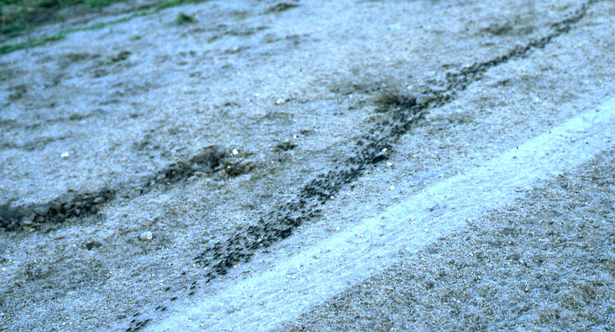 Eine Kolonne schwarzer Ameisen quert die Piste. Die Reifenspur gibt einen Anhaltspunkt für die Größe.