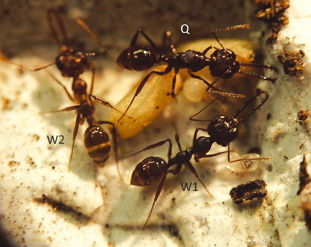 Fig. 1. A founding colony of Myrmoteras iriodum. Note that body size of the first worker (W1) was not nanitic, but was